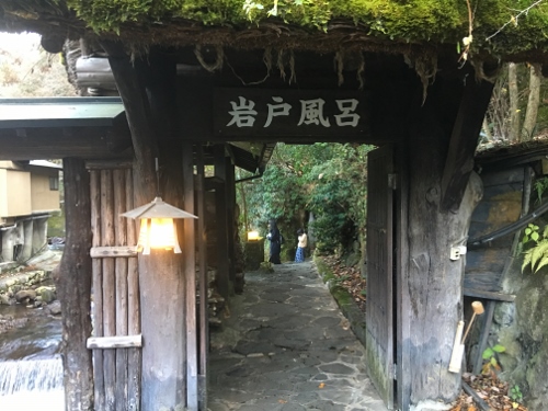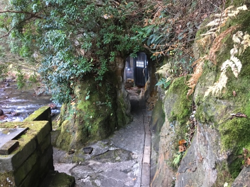 宿の通路をとおり、川の護岸の上をとおって、一番奥の崖下に岩戸風呂はあります。