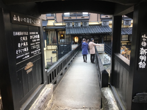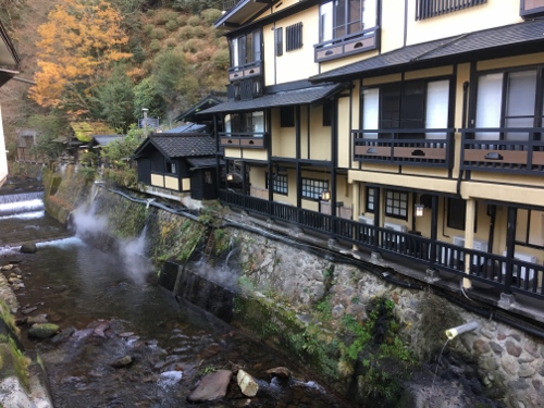 田の原川の渓谷の両側にこぢんまりとした和風旅館が建ち並んでおり、渓谷にある
