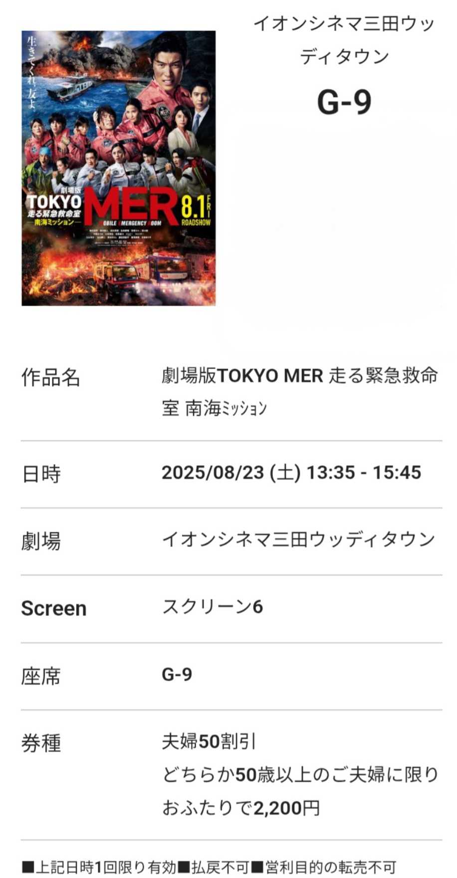 久々の一緒の休日(明日は消防装置点検の日で部屋の片付けがあるのですが・・・)避暑も兼ねて?行って来ました劇場版 TOKYO MER 南海ミッションいつもの通路席は確保出来ませんでしたが・・・(憶測通り)左右が1席空いてリラックスして鑑賞する事が出来ましたさて劇場版2作目 ネタバレ は書きませんが・・・TVの時からそうでしたがいやいや!タイミング!!それは~~ドラマたから~~はありますが~~今回もまだまだ・・・あるでしょ?いやいや!そう来たか~~~ ダンダッダ!ダンダッダ!! ダ~ンダッダ~っとあの音楽か流れると~「何が?来る?」「ほら来た~~」えっそう来たか~~~充分楽しませて頂きました昔はフジがっドラマのフジって言われててその時のドラマは・・・今見ても良かったですがっ今はTBSなのかな?資金?制作費がかけれるんだろうな~~って考えがよぎって・・・あくまでも 個人的主観 ですが劇場に足を運んで良かったと思える映画でしたあっと言う間の2時間でした次回が あるとすれば~~ どないするんだろう?