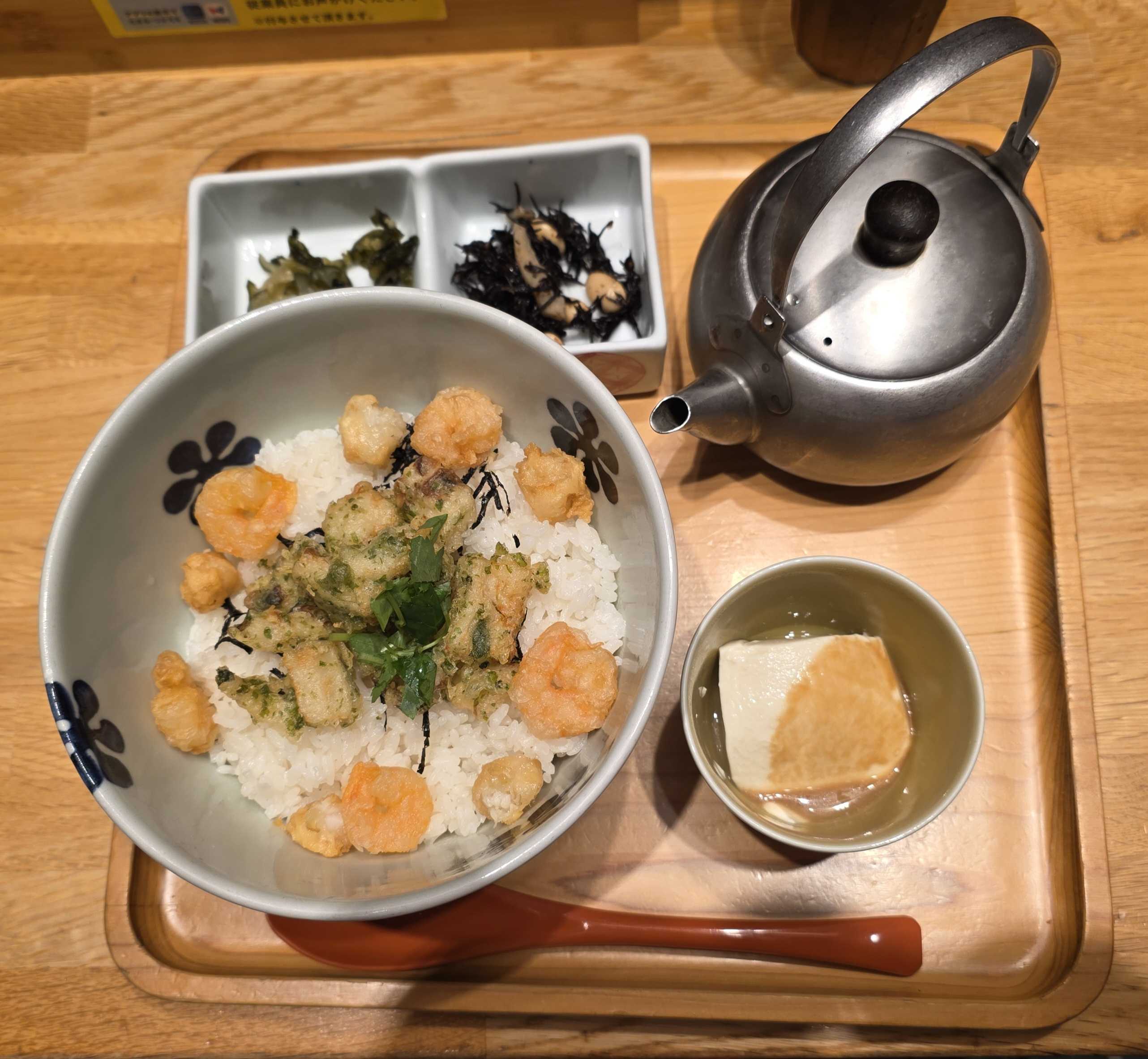 本日の朝食ですエキマルシェ大阪 にあるだし茶漬け えん さんでかなり・・・迷ったんですが・・・小海老・小柱・磯天ちくわを刻んで青海苔とともに磯辺揚げにし、海老と小柱を添えました。磯の香りがたまらない食べ応えのあるだし茶漬けです。にしました プライス¥980円 朝から・・・だし茶漬けとは言え 贅沢なスタートですチョイスは間違いなく 美味しく頂きました