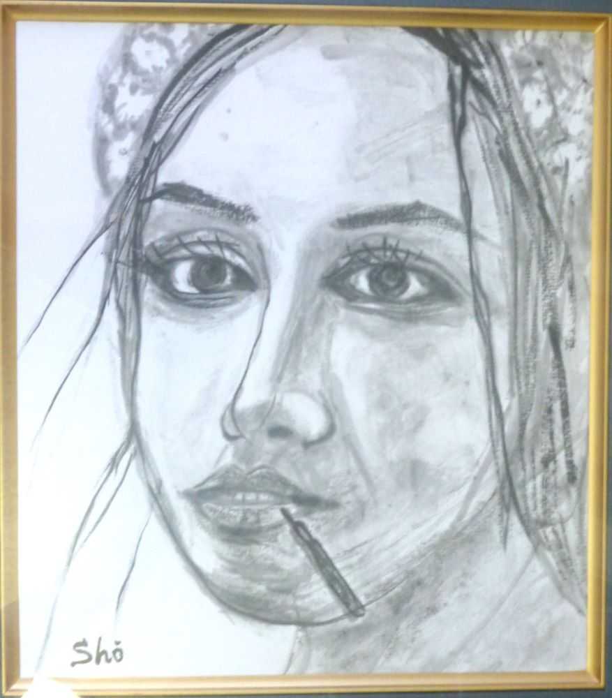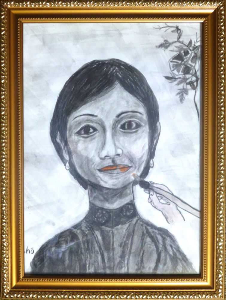 キャンバスに大本は、白黒写真からアクリルで描きました
