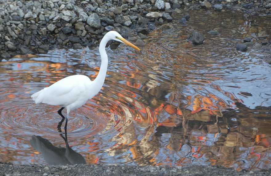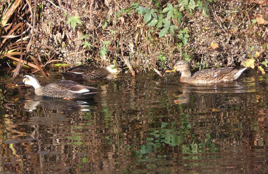 08:17、南浅川最下流のカルガモに別種?が混じる。このあたりにマガモのオスはいない。