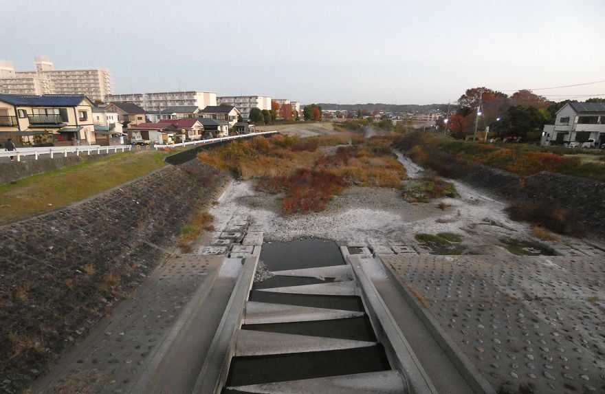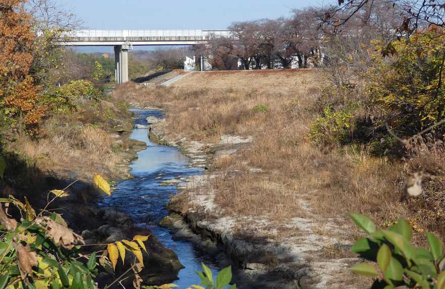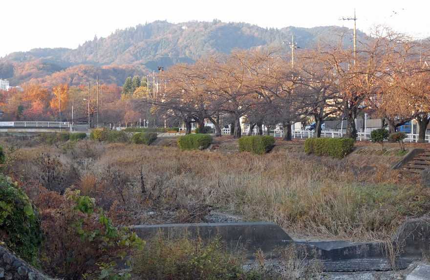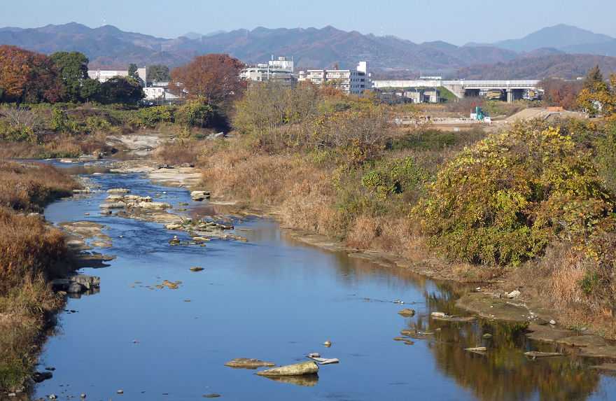 08:23、市役所北側の鶴巻橋の真ん中で浅川上流側を眺める。