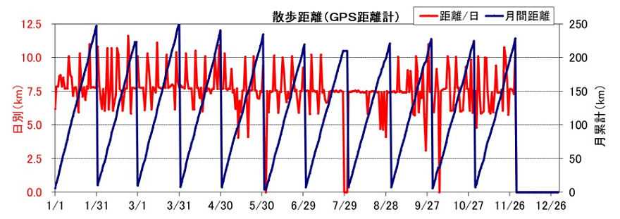歩行距離(ハンディGPS):10、200m(50単位に切捨て)