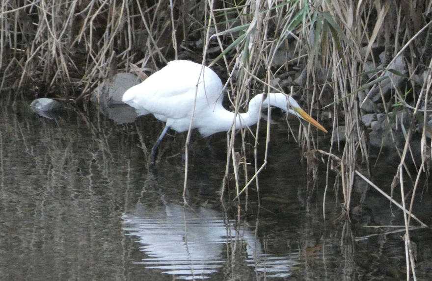06:16、今朝の横川橋上流側水たまりはダイサギ。持ち帰った写真を見ると水に映ったカワセミが居た。