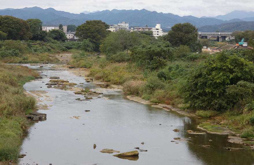 07:18、市役所北側の鶴巻橋の真ん中で浅川上流側を眺める。