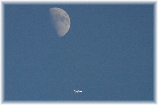 晴天ですが上空は不安定で夏雲がモクモク発達して崩れて行く模様が手に取るように観察できました、昨夜は久しぶりの雷雨になりました、撮影は上空の航空機ですがはなかなか残月に飛び込んでくれません狙ってるのですが...夕刻になって航空機が雲をひきはじめました これは...とばかりにシャッタ-をきりましたが遠すぎです