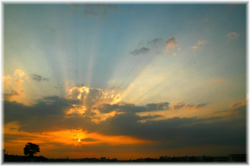 八尾空港コントロ-ルタワ-の上に夕日が落ちる日でしたが雲が多くて 左から夕日、タワ-、VOR、