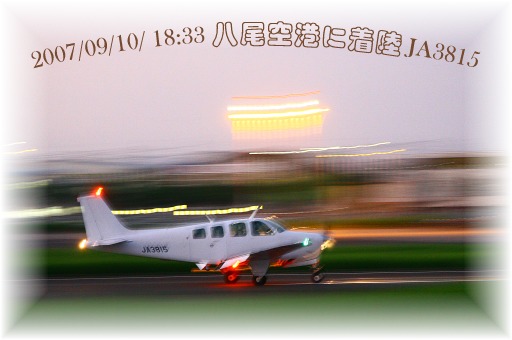 9月10日18:33 閉まっていた八尾空港の格納庫のドア-が開いたので飛ぶか帰ってくる合図です、ラジオからJA3815のコ-ルが聞こえてきたので慌てて仕舞い込んだカメラとりだしたが暗くなっていたので駄目かとおもいましたが一枚だけは機体番号が映るカットありました、航空グッズの店http://www.ontop.jp/のスリ-エイトワンファイブクラブの機体です