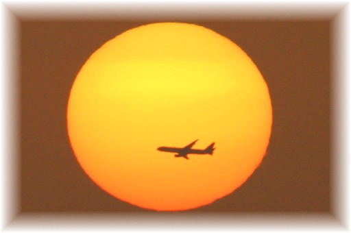 夕陽面通過の航空機狙いで撮影にでかけて昨夕は二機捕らえました~!\(-^〇^-)/アハ 八尾空港のランウエイのコースは建築物の高度が規制されているので落陽直前まで関西空港の離着陸機が太陽面に重なるチャンスが有るのです 大阪湾上空 神戸空港付近に着陸機が着陸灯を点灯しているのでトラフィックが予測できますナンバーツーが右の黒い機影はナンバワンに着陸するのですエキステンドのコース取りだったのか? 夕日面に一足早く飛び込みました、円周の気流の乱れがたまらないいのです、元JET エンジンマンの血がいまだに騒ぎます<(^ー^ι) 続く/ 黄砂で視界は20kmそこそこですが太陽の輝きを抑えてくれますので狙い目かもしれません、太陽の大きさ一つずれる悔しさは何度味わったことか?(○ ̄ ~  ̄○;)