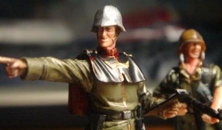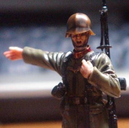 本日三つ目の記事です。一般兵Bを組んだ後は今度はクランプ中尉を組み始めました。基本は一般兵Bと同じです。これもただ説明書通りに組むのではなく(殆ど説明書通りだ!)色々つけました。まず頭を額の真中辺りで切断しヘルメットを被せました。後は腰に余っている水筒・バックパックを付けアメリカ歩兵装備品セットから銃剣・M1ガーランドライフルを拝借し装備しました。 塗装箇所は襟・マントの裏側…ガンダムマーカー ガンダムレッド胸章・肩章等…ガンダムマーカー ガンダムゴールド髪の毛…ガンダムマーカー ガンダムゴールドホルスター…ガンダムマーカー ファントムグレー水筒…ガンダム(ry ジオングレー銃剣…ガ(ry ファントムグレーバインダーの紙のところをガ(ry ガンダムホワイトM1ガーランドライフル…一部をガ(ry ガンダムガンメタリック後はヘルメットと金具のところをガ(ry ガンダムシルバーです。それから顔と腕も同じようにリアルタッチマーカーのリアルタッチグレー3で軽く汚した後リアルタッチピンク1で、他の服・装備品も全てリアルタッチグレー3で汚しました。さすがに2体目なので幾らかは慣れてきました。しかしこのクランプ中尉、一般兵Bのようにそのままでは立ってくれずすぐ後に倒れます。そこでプラバンを適当な大きさに切ってスタンドにしボンドで貼り付けました。