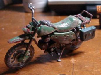 前々から組んでいて今日完成した汎用中型オートバイ B.M.C. Z78/2について書きます。 これは普通に色を塗りながら組んで完成後にウェザリングをしました。塗装箇所はランプ…ガンダムマーカー(以下ガマ) ガンダムゴールドテールランプ…ガマ ガンダムメタレッド車輪・マフラー・スタンド及びハンドル周辺…ガマ ガンダムメッキシルバーエンジン…ガマ ガンダムガンメタリックタイヤ…ファントムグレーサイドバッグ…ガマ ジオングレーウェザリングほぼ全体をウェザリングマーカー ガンダムサンドブラウン(砂)で、フレームを中心にウェザリングマーカー ガンダムラストレッド(錆)でしました。個人的にこの荷台の錆び表現は我ながら上手く出来たと思う…。