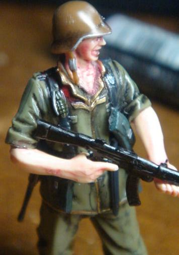 今度はゼイガン軍曹についてです。これも今までの一般兵と同じ様に装備品を替えたりしたくらいで基本は説明書通りです。 装備品の変更点は胸のところにアメリカ歩兵装備品セットの銃剣を装備腰にアメリカ歩兵装備品セットのスコップをアサルトライフルのマグパウチを下腹部ではなく腰にし数を2つにしたぐらいです。塗装箇所はゴーグルのフレーム部・ヘルメットの顎当て・ベルトのバックルを始めとした金具部…ガンダムマーカー(以下ガマ) ガンダムメッキシルバーバックパックのベルト部・銃剣・スコップの柄…ガマ ファントムグレーマグパウチ・水筒・ヘルメットのベルト…ガマ ジオングレー首周り…ガマ ガンダムレッド胸章等・・・ガマ ガンダムゴールドアサルトライフル・・・ガマ ガンダムガンメタリックです。それからバックパックの小隊用小型通信機からアンテナをつけました。計3本ほど。アンテナは自作です。作製方法はランナーに着火し他の要らないパーツにその燃焼部を押し付けて冷めないうちに思いっきり引き伸ばします。それであんな感じの細い線が作れます。結構黒煙が出てそれがまた臭く有害っぽいのでやるなら風通しが良いところでやったほうがいいです。それからまたいつものようにガンダムリアルタッチマーカー リアルタッチグレー3で汚しました