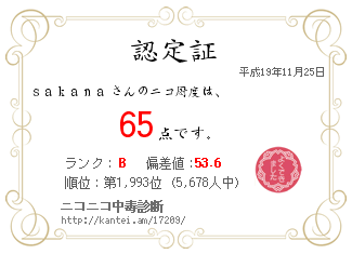 今日も相変わらず昼まで寝ていました。起きたのは12時過ぎだったです。まぁ家族にちょっと外食しに行くぞと起こされたんですね。自分としてはもうちょっと寝て居たかったというのが本音でしたね。何せ昨晩寝たのがもう4時前頃でしたから。ニコ動見てたりプラモ弄くったりしてたらいつの間にかそんな時間だったんですね。まぁその外食から帰って来てまずしたことはパソコンの起動。それでニコ動を一通りランキングとか見て掲示板とか廻ってました。それで↓の動画がランキングにあがってたんですね。【ニコニコ動画】一般人とオタクの境界線[あるあるorねーよ]有野はヲタ 濱口は変態これ見てたら自分はかなり一般人でしたね。オタクの方で当てはまったのほんの数個でしたから。例えばアニメの声優のことを"中の人"と言ったりその程度でしたね。あとテレビ番組のBGMがアニメのサントラのかどうかとか。何気なく見てて知ってるアニメのBGMとかだと嬉しくなったりしません?ってか最近テレビ自体を見ないんですが。まぁ↑に関連する事ですが昔NHKの書道の講座みたいな番組でエクセル・サーガのサントラが流れてて驚いたことがありますね。前にも同じ事書いたかな…まぁいい。まぁそれでその動画の途中にちょっと気になる画像が出てきたんですね。それは"ニコニコ中毒診断"というやつでぐぐったらすぐ出てきました。それで早速やってみました。で結果が↓です。 結構来てます。もうニコ中と言われても否定はできないでしょう…。まぁ否定する気は無いですが。それで他にも面白そうなのがあったからやってみたんですね。先ず"ガンダムオタク社会適応度チェック"。91とかね。もう笑うしかないわ…。何かもう諦めろ見たいな事書かれてました。次に"ジオン公国軍士官採用適性試験"と言うもの。結果は↓ まぁ見ての通り90点でした。それで詳細は↓な感じでした。sakana士官候補生の得点は、 90 点である。 ランク:A (A~E) 偏差値:64.0 順位 :241位 (4,904人中) 項目別評価項目 ランク(A~E)一般教養 A パイロット適性 A 戦艦乗員適性 A 指揮官適性 B 総評 貴公を中佐に任命する。 sakana士官候補生の搭乗モビルスーツゴッグもうジオン公国の職業軍人になっていいですか?リアルでこれだけ偏差値があったら…。でも搭乗MSがゴックというのが…。せめて"ズ"を先につけてくれないか?と。で、まぁ他にも"オタク度チェック"とかもやってみたんですね。で、結果は↓ まだ何とか大丈夫なようですね。あと"有名アニメ認知度チェック"結果は↓です。 こっちの方が高いんですね。まぁそれぞれにコメントが付いてくるんですが何れも"今なら間に合う、引き返せ"みたいな内容なんですね。まぁ友人みんなこんなんだから付いていくなって言ってたら今から俺孤独になっちまうよ、と。で、まぁ今日はこんな感じで過ごしてました。こういう心理テストとか鑑定とかって結構面白いですよね。そう言えば明日最後の長距離走があるんですね。距離は5.5Kmだったかな…。ちょっと記憶が定かではないですが多分こんな感じだったと思います。それで…まぁ…時間内に走りきれるかが心配です。いや、走るのホント苦手ってか嫌いなんですよ。持久力ないし。それに体調は優れないし、膝は痛いし。それに走るのが5時限目とかね。昼飯のすぐ後。リバースするやん…と。…ん?勉強?何の事です?