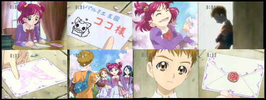 ココ達と別れそれぞれの夢に向かって日常をおくる戦隊員。リーダーはココ宛てに手紙を書いていた。・・・このあて先で届くと思うのか・・・さすがリーダービックです。手紙を届けたいと願う戦隊員の前に謎の少年が現れる。そして逆にあて先主不明の手紙を渡される。その手紙が何なのか、送り主は誰なのか戦隊に質問攻めに会う少年。新キャラの洗礼にしてはやりすぎだ・・。手紙を開けるとフローラと名乗る女性の映像が映し出される。フローラは、「自分はもう直ぐ消えてしまう。危険がすぐそこまで迫っている」と告げた上で、戦隊の力が必要だと言う。その問いに、リーダーは選択肢なしで「協力」決定!・・・新番組にしては凄い導入部だな。。。(前作で性格が理解できているので違和感が無いが)フローラは「キュアローズガーデン」で待っていますと言い残し消えた。そして手紙はGBASPローズパクトへ変貌。(前作で言うドリームコレットの位置付けのアイテムか?)それを見た少年はローズパクトを奪おうとするが、またも戦隊の質問攻めに合う。怒りゲージがMAXに達した少年はリーダーのみを連れ去りエリア移動。町にある時計台の最上階に移動した二人、ローズパクトの事を知りたい少年の質問をリーダーは眺めに夢中で完全無効化。少年が一流の「運び屋」だと聞き、パルミエ王国へ手紙を届けて欲しいとお願いするが・・、少年はココを知っているらしく拒否られた。。。一方、新パルミエ王国(建設中)では、国王の戴冠式を控えたココとナッツが。しかし、ココとナッツが国王になる事を他の4つの王国の国王は好ましくないと思っているらしい(・・邪悪の神かやつらは。。)国王たちの控え室が何者かに襲撃された、現場を見ていたミルクさんの証言では「国王は攻撃を受けて散り散りに飛ばされた」との事。普通、この状況だとさらわれるのではないのか?そして襲ってきた奴らは「エターナル」と名乗っていたらしい。影時間の開始と共に手紙を落すリーダー。。。それを少年がキャッチ。「大切なものは絶対に手放すな、大事な物ほどすぐに無くしてしまうモンだ・・」少年、一話から名言を残すな・・と言うより、この先の話の伏線だと思うが。その時、「何か来た!」と少年。「何処かで聞いたセリフ?」とリーダー・・ココ達がナイトメア探知機だった様に、この少年はエターナル探知機能力を持っている様だ。現れたエターナルは少年(シロップ)に何か良い情報が無いか尋ねてくる。ローズパクトは絶対出すなとヒソヒソ声で指示するシロップだが、リーダーは惜しみも無く披露。。。ローズパクトを見つけたエターナルは奪おうと攻撃を開始。シロップは大きな鳥に変身し一時逃れるが、追ってきたエターナルによって追い詰められる。そこへ戦隊員も合流。ココはしゃべり言葉の語尾に「~ココ」、と付いたがシロップも漏れなく「~ロプッ」と付くシステムだ。変身し戦闘態勢に入るエターナル、迎え撃つ戦隊!新番組開始からまだ変身アイテムを入手していないのですが・・、どうするのかと思えばリ「逃げろっ」他「Yes!」コレには驚いた、正直ジョセフもビックリな逃亡劇。。。(第二部の開幕でこのパターン・・まさかジョジョへのオマージュか?)しかし、生身の逃走がエターナルに有効なはずがなくあっさり追いつかれる戦隊。その時、ココとナッツが登場。さらに、ローズパクトの光で「変身携帯キュアモ」が誕生。変身カットだが、「プリキュアメタモルフォーゼ」の場面のキュアモを構えるカットが正直いらない。。。しかも前作と違い、この場面の動きが無い事から衣装が変わっても余り演出的においしくないのではと心配すらする。変身時の演出はユウナも顔負けのドレスアップだが、上級生2名の変身カットが以上に少ない気がする。今回は時間の都合で省いたと思いたいが、前3人がパーツ毎に演出があるのに大して緑・青は全身一括演出のみ・・・コレはマズイだろ。個別変身後の「希望の力と未来の光、華麗に羽ばたく5つの心」の演出は前作比200%の出来。しかし・・前作も思ったのだがルージュのカットだけがやけに力が入っている気がしてならない。。。変身に時間を取り過ぎた為、今週は戦闘パート無し。。。オープニングは不満だが、今年も安定しそうな感じはした。来週は、新必殺技公開だと思うので楽しみだ。