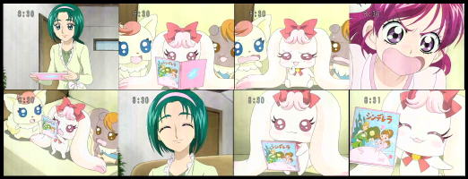 ミルクに本の差し入れをする緑。ミルクは小説を書きたい様子で、まずは既存の本を模写し文章力を高める作戦らしい。小説家を目指す緑はとてもうれしそうにバックアップするが、冒頭からサブミッションの雰囲気満載だ。「シンデレラ」を模写するミルクだが、ただ書き写すだけでは面白くないとアレンジを施す。配役としてシンデレラはリーダー確定。2人の姉役にかれん様とりん(かれん様の配役はかなり適正だ)、意地悪なお母さん役に緑。。。サブミッションな話だが、緑の配置が素晴らしい。(役の配置だけでこれほどツボにハマるとは思わなかった。)ドジっ娘のシンデレラは掃除がまるでダメ。姉たちはもっとしっかりやれと言うが、それは無理と言うものだ。だって奴にはデフォで「掃除箇所倍加」のスキルが発動しているから。(掃除系の仕事を命じると掃除箇所を自然に増やしていく恐るべき能力だ)舞踏会の時間になり準備を始める3人。リーダーも行く気満々だが、「話の決まり」と言う事で留守番確定。舞踏会に行きたいリーダーの前に魔法使いのうららが現れ、魔法でドレスを出してくれる事に。ある意味今回の見せ場だと感じていたが、出てくる衣装は想定の範囲内で正直面白くなかった。。。12時までに戻らないと大変な事になると告げるうらら。そうだよな・・影時間始まっちゃうモンな。冷静にツッコミを入れるとするなら「カボチャの馬車」の存在自体が闇に隠蔽されている今回のお話は有りなのか?舞踏会場に潜入し、「何も無い平地で転ぶ」と言うドジっ娘属性スキル発動でココ王子様をゲットしたリーダー。意地悪なお母さん役の緑もナッツ王子をゲット。。。(・・・ヤバイ・・今回かれん様の活躍がまったく無い予感。。タイトルが「ツンデレラ」ならかれん様配役で良かったと思うが。)魔法使いのうららもドレスアップして舞踏会へ参戦。既に何でも有りの状態に突入してます。。。2回目の「何も無い平地で転ぶ」発動により、ミルクの妄想が一旦終了。模写するミルクにリーダーは差し入れを持ち込むが、原稿を見られたくないミルクは執筆場所を変更する事に外出。しかし、ナイトメアのブンビーさんに遭遇し、原稿を利用される事に。最近思うが、ブンビーさんが敵として出る回はサブミッション(特にお笑い系)の場合が多い気がする。番組当初は幹部扱いだったが、かなり堕ちる所まで来ているな。。ミルクの危機を感じて外に出る戦隊だが、シンデレラワールドへ引き込まれる。戦闘パート突入だが、今回の変身シーンはドレスでの各人カット仕様。いや良いとは思うのだが、5人合わせて約2分使われるのはどうかと思うが・・・。(この時点で今回のアクションシーンは消化試合と思わせてくれる辺りが微妙)DVDの特典映像に、コスチューム別の変身シーンを入れてくれるとかなり満足度高いと思われ。(現状での首位は「リーダーのうさぎぬいぐるみ」からの変身)消化試合と思われたが意外にアクションシーンは頑張っていた。しかし、最近の傾向で「押しつぶし→戦隊が支える→転倒→反撃」のパターンがマンネリ化しつつあると思うのだが。黄の近距離大キックが「モリガン」ばりで素晴らしかった。回転具合が良く、コレで多段ヒットなら次回以降の主力でも使えそうだ。トドメは容赦なくリーダーの「プリキュアクリスタルシュート」。・・・正直、このレベルの相手なら「ドリームアタック」で十分だと思うが。戦闘パート終了後、影時間の開始が迫る。階段で本日3回目の転ぶスキル発動により、現実世界へ帰還成功。何と「硝子の靴」が存在する。「硝子の靴を履いた者は王子様と結ばれる」と言う事で、履く気満々のリーダー。(履けなくてもフラグ立っているから問題は無いのだが・・)しかし、その時まさかの事態が・・。ミルクが硝子の靴にパイルダーオン!!ぴったりです。。。これにはリーダーの怒ゲージもMAXだ。