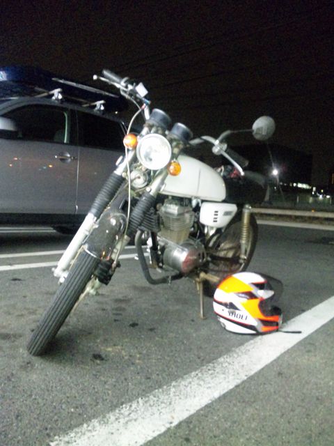 とりあえず形にしました。いやー。外装きったないなぁ・・・次は外装をきれいにしていく感じですね~明日から燃費を気にしないで会社にいける・・・さて・・・リッターいくつはしるかな?とおもったら、スピードメーターワイヤーきれてるのわすれてた・・・用意しないとね・・今のところのスペックはCB50Jフレーム(溶接多数)CB50JXフォークNSR50Fキャリパー&マスターエイプ100エンジン(115cc)エイプ100純正マフラーワゴンRワイドATFクーラーXEステップこんなもんかな?いがいと普通。いや、普通でいいんだよ。見た目ノーマルだからかっこいいんだよ。CBはね。しかしまぁ・・・コンビニはいるとおっさんに「懐かしいののってるね~」って絡まれたりあんちゃんに「これ、エイプっすか?めちゃくちゃいじってますねー」やら・・・エイプじゃねぇよ。すでに3回くらい聞かれたは・・・まぁ渋いながら目立ってる証拠ですね。エイプ、CD、CL、モンキーなどとは又違う渋さがいいのさ。ホンダのTボーンフレーム車はいいものばっかりだね。