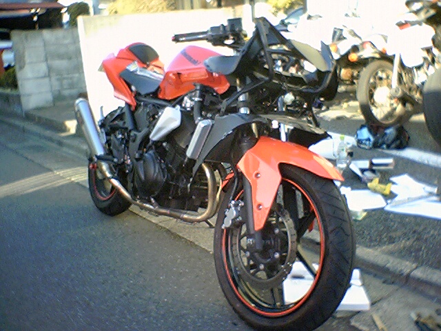 友達のNinja250Rのちょっとした改造を手伝いました~電装系ですね~実は苦手・・・(ボソ内容は~・シフトタイミングランプの取り付け・ELメーター板の取り付け・前後ウインカー変更の三つ。いやぁ・・・最近のSSはカウルしっかりとまってるんだねぇ・・・スクーターみたいに爪ばっか。正直めんどくさい!んでシフトタイミングランプはタコ配線の回転数配線やらプラス、アースを取り後はセッティングをするだけ。外装なければすぐつけられる代物ですな。んでELメーター。これがまた・・・説明書が適当でめんどくさかったは~スピードメーターの針をちょっと切らなくては入らないとかドンマイ過ぎるwまぁこの二つをやったあたりで暗くなってしまい今日は家でやったので暗くて結局サイドカウルの取り付けは明日に。爪やら穴やら暗くてみえましぇん。
