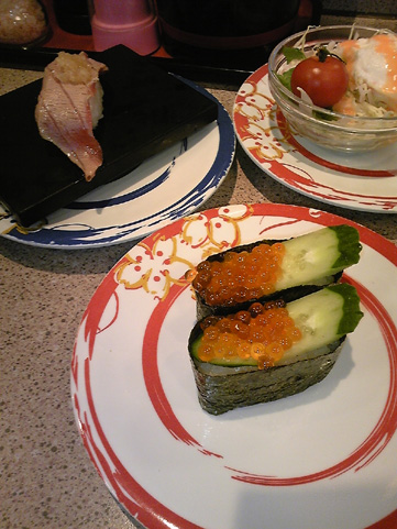 こないだ志免のイオンモールのそばの「はま寿司」に行ってきました。この付近も筑紫野と同じく回転すし屋がたくさん出来てます。イオンモールの中に「寿司めいじん」「くら寿司」の隣に「はま寿司」空港方面に少し行くと「スシロー」回転寿司にはよく行きますが、実は魚介苦手です。お子様寿司ばっか食べてるいいお客さんです。なので基本どこのお店でもいいんです。「ムムッここのカッパ巻のきゅうりは一味違う!」とかはないです(笑)↓シーサラダとすじこ?↓平日は90円&クーポンであおさ汁無料でしたよ。Designed By チワワン子