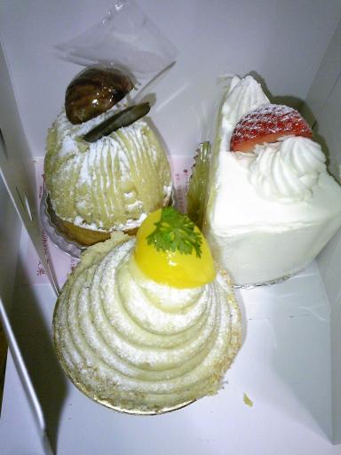 今日は相方の誕生日なのでケーキを食べる日。ちょっと多めに2店舗で計5個買ってみた。モンブランとショートケーキをそれぞれ買って食べ比べ。はじめてのケーキ屋で買ったほうのケーキが激甘。しばらくケーキはいいわぁ...っていう気分になった。↓モンブランがどっちもイマイチやった(泣)Designed By チワワン子