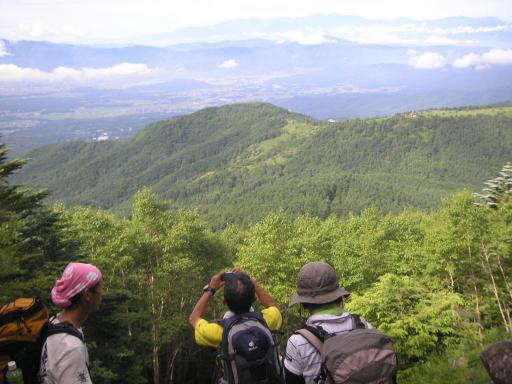 今日は、一ケ月雨のため延び延びになっていた会社のハイキング。2、3日前に東海地方も梅雨明けとなった。例年よりかなり早い梅雨明けだ。目指すは山梨県市川大門町の蛾ケ岳(ひるがたけ)。好天に恵まれて朝6時にいつもの流通センター駐車場に集合。今日のメンバーは子供たち5人を含め総勢14名。M田社長ファミリー、Y崎ファミリー、H井ファミリーなど久しぶりのメンバーが多い、また、最近アウトドアづいてる若者T浪クンもブランド志向でウェアやギアを揃えはじめており楽しみな存在である。顔合わせを済ませてクルマ3台に分乗し登山口の四比連湖(しびれこ)に向かった。静岡から途中休憩を含めて約3時間。駐車場にはまだ1台のクルマもなかったが準備をしていると続々と入ってきた。駐車代400円を管理する湖畔の水明荘に支払したあと幅広い山道を四比連峠に向かう。時々スーと吹く風がその瞬間だけ涼しい。しかし思ったより相当暑い!けっこう蒸し暑い!野沢一の文学碑の前で一本立てる。反対側の大門碑林公園からの山道もMTB向きの楽しいコースだ。後続のグループとあいさつを交わして早々に着いた大畠山は人工物があるだけで展望もなく暑くて長居はできない。その後は、ほとんど平坦なトラバースが続いて六地蔵のある西肩峠着。ここから15分、今日初めての登りらしい登りで山頂に着く。着いたときは雲が多く周囲の展望もなかったがタイミング良く次第に雲がなくなって眼下の四比連湖をはじめ南アルプスや奥秩父、富士山が見渡せるようになってきた。大汗を流したあとの冷えたビールは格別に旨い!!見上げた青い空にミズナラの緑が映えてハイな気分だ。見渡すと、ボクはレギュラー缶だったがH井クンはやっぱりロング缶、T浪クンはレギュラー缶にウメッシュ缶と豪勢だ。皆さんもお得意のクッキングでランチタイムが楽しそう。ほぼ貸切状態だった山頂も間もなく伊豆の下田からやってきたという50人位の団体さんでいっそう賑やかになった。1時間少々の休憩後、12時30分下山にかかった。ヘルメットに膝のプロテクターを付けての下り、山頂直下はやや急な下りだがオールクリーン。昔は段差もあってもっと難しい路面だった記憶があるのだがハイカーが増えて地形が変わったのかも知れない。要所でメンバーを待ちながらマイペースで走行する。ボクのあとからY崎さんちのK哉クンが風小僧の如く走りくだりついてくる。頼もしいかぎりである。あとで聞いたら1回転倒したそうだ。相変わらずの暑さのなか時々来る風が心地良い。今日見た花は少なくヤマホタルブクロとオオバノヨツバムグラくらいのものだった。いっきに下りきって着いた四比連湖でちょっとのんびりだひと月遅れのハイキング、涼を求めてきたつもりだったが甲府盆地は暑かった。標高1279mそこそこでは簡単に涼しい風にはありつけなかった。そんな悪条件?のなかで今日は余裕で頑張った皆さんに「ほんとうにお疲れ様でした」と言いたい。帰路、近くのみたまの湯へ寄って汗を流して帰静した。