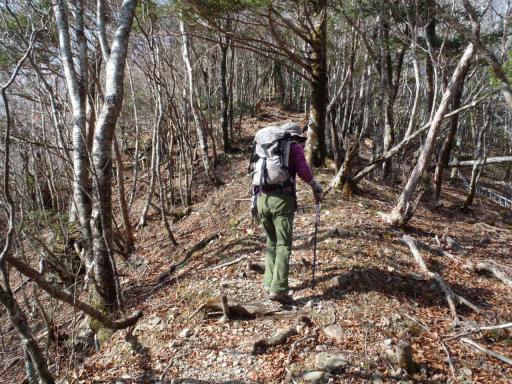 実に34年ぶりの乾徳山、女房が山頂直下の岩場を嫌がってつい行く機会を逸していたのだが今日は地域の防災訓練で同行できない、これはいいタイミングとばかりにM田さんとM本さんを誘って行ってきた。人気の山とあってすでに徳和の駐車場には10台ほど。今日は、8の字を描くように徳和~国師ケ原~扇平~乾徳山(2031m)~水のタル~高原ヒュッテ~国師ケ原~道満山~徳和を歩く予定だ。比較的水量の多い錦晶水を過ぎ緩やかな登りが続いて樹林を抜けると辺りが開けた国師ケ原に着いた。シラカバの樹が多いすてきなところだ。樹間に高原ヒュッテの赤い屋根が見えている。左前方に三角錐の乾徳山が現れる。カヤトの扇平に近づくにつれ視界が開けてきた。扇平の月見岩から眺める雄大なパノラマは素晴らしい!!御坂山塊の先に富士山も、、!山頂に向かって急登が始まり樹林帯を抜けると最初に出てくるのは髪剃岩。ここからの展望も高度感があっていいなあ少しお疲れ気味かな?M田さん!すぐに現れる鎖場を登るM田さん。ん、まだまだ行けるさ。山頂直下、10mほどの岩場がこの山の極め付けだ。鎖場をよじ登るM本さん。いかにも楽しそうである。狭い山頂は、ハイカーで満席状態だった。360度の眺望を楽しんだあと記念写真を撮ったのみで早々に黒金山方向に下ることにした。下り始めると数日前のものか降雪が現れた。水のタルで黒金山への縦走路と分かれ急坂を下り、乾徳山の西面をトラバースして高原ヒュッテのある国師ケ原に戻った。ここでやっとランチタイムである。慣れた?ニホンジカが近づいてきて興味深げにこちらの様子をうかがっている。たぶん母子かな?国師ケ原付近に多かったツルウメモドキ(ニシキギ科)の赤い実道満山に向かう。落葉した枯木立の林もまた明るくて気持ちがいいもんだ!左に大平牧場を見下ろしながら道満山(1314m)を越え徳和へ下る。木洩れ日が射すミズナラの林にはまだ少し紅葉が残る。落ち葉がびっしり積もった道満山からの下りは快適!MTBなら乗車率100%だろう。最後は、車道に降りて山歩き終了。いま、山麓の紅葉が見ごろか。徳和の集落を抜けて駐車場に戻った。下山後は、ぶどうの丘の天空の湯(600円)へ入湯。露天風呂から眺めた赤い夕陽と南アルプスの黒いシルエットが美しく今日の疲れを癒してくれた。