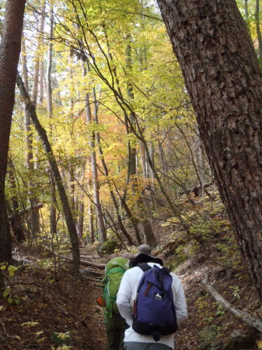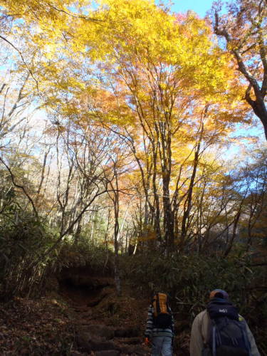 息子たち夫婦と一緒に山梨県北杜市の日向山へ行ってきた。7月、鞍掛山に行く際に通過して以来の日向山だ。朝7時30分に自宅を出発。2時間少々で道の駅はくしゅうに到着。予期したとはいえ矢立石登山口のかなり手前から路肩に駐車のクルマが多い。とりあえず登山口まで走ってみたが奥にある林道ゲートまで超満車。あの狭い林道で戻ってくるクルマと登ってクルマが鉢合わせ状態でどうにもならない。なんとか駐車スペースを確保して出発したが3連休の中日、紅葉を求めて来たクルマは50台以上は入っていたようだ。初めて日向山を訪れたのは当時入会していた山の会の山行で35年まえの11月だった。四季折々なんど行ってもいい山だが、ちょうど登山ブームに乗ったこともあるのだろうがこれほどの混みようは初めてのことで驚いた!10時50分に矢立石登山口をスタート。このあたり広葉樹が多く紅葉もいま真っ盛りといったところか!登山道はよく整備されて歩きやすい。樹間からのぞく富士山。うっすらと新雪が載っている~鳳凰三山・地蔵岳のオベリスクが凛と立つカラマツ林に入れば山頂は近い~アメダス自動雨量計、三角点を過ぎ12時30分に日向山1659m(雁ケ原)に着いた。遠く八ヶ岳の中腹がよく紅葉している。甲斐駒ヶ岳の勇姿をバックにハイ・ポーズ!花崗岩が風化してできた山頂部から紅葉の目立つ雨乞岳を見る。去年の秋、MTBを担いで平久保池から北東尾根を登り、山頂から石尊神社までをトレイルライドしたときのすばらしい紅葉が印象深い。風もなくついまどろんでしまう暖かさでのランチタイム後、下山にかかる。錦滝への下りは、甲斐駒ヶ岳を正面に見ながらザレ場下りから始まった。沢沿いの樹林帯も美しく紅葉している。所々で出てくる急坂を慎重に下り、鉄製の赤いハシゴを降りればじきに錦滝に着く。水量はやや少ない。尾白川林道をのんびり歩く~黒戸尾根もよく色づいて秋深しを思わせた。15時50分、登山口に戻る。下山後は、市川三郷町の「つむぎの湯」に入湯、帰路についた。