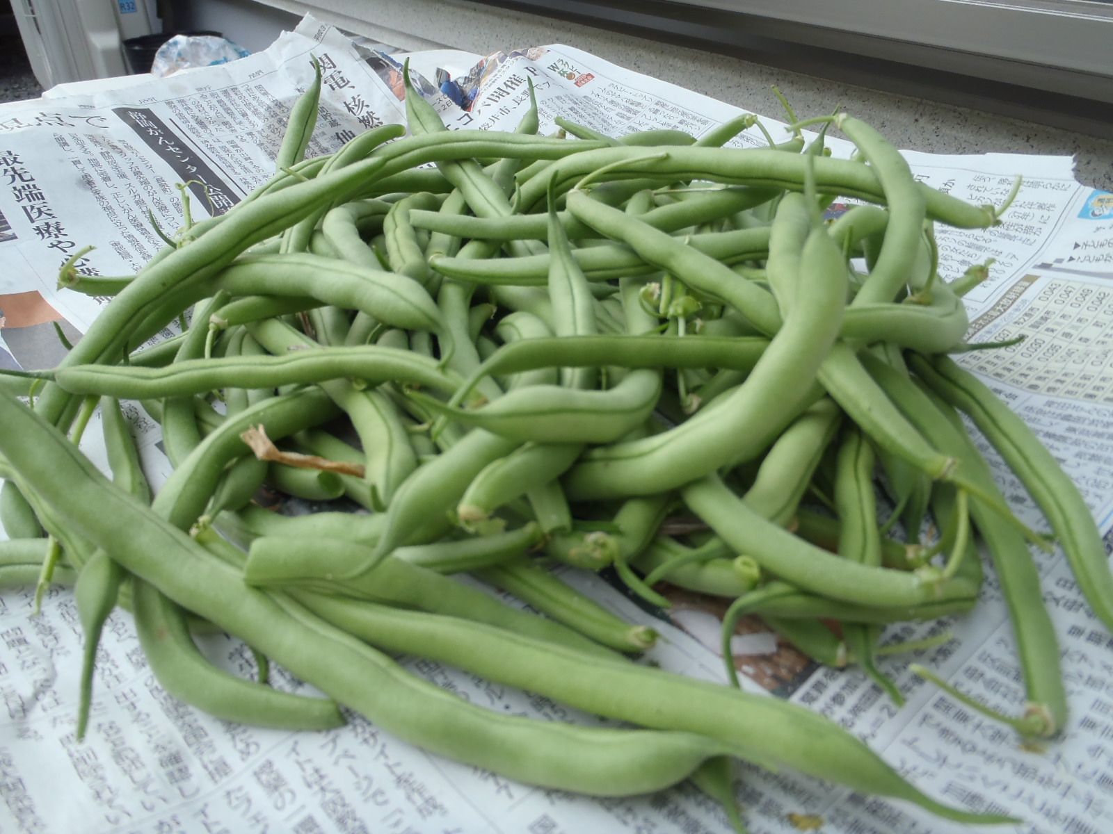 雨やら何やらでちょっと手を抜いていた畑にはインゲンがたくさん菜っていた。つる性のつもりで誘引のネットも張ったのに「つるなし」のようである。晩酌のつまみにもってこいだ!