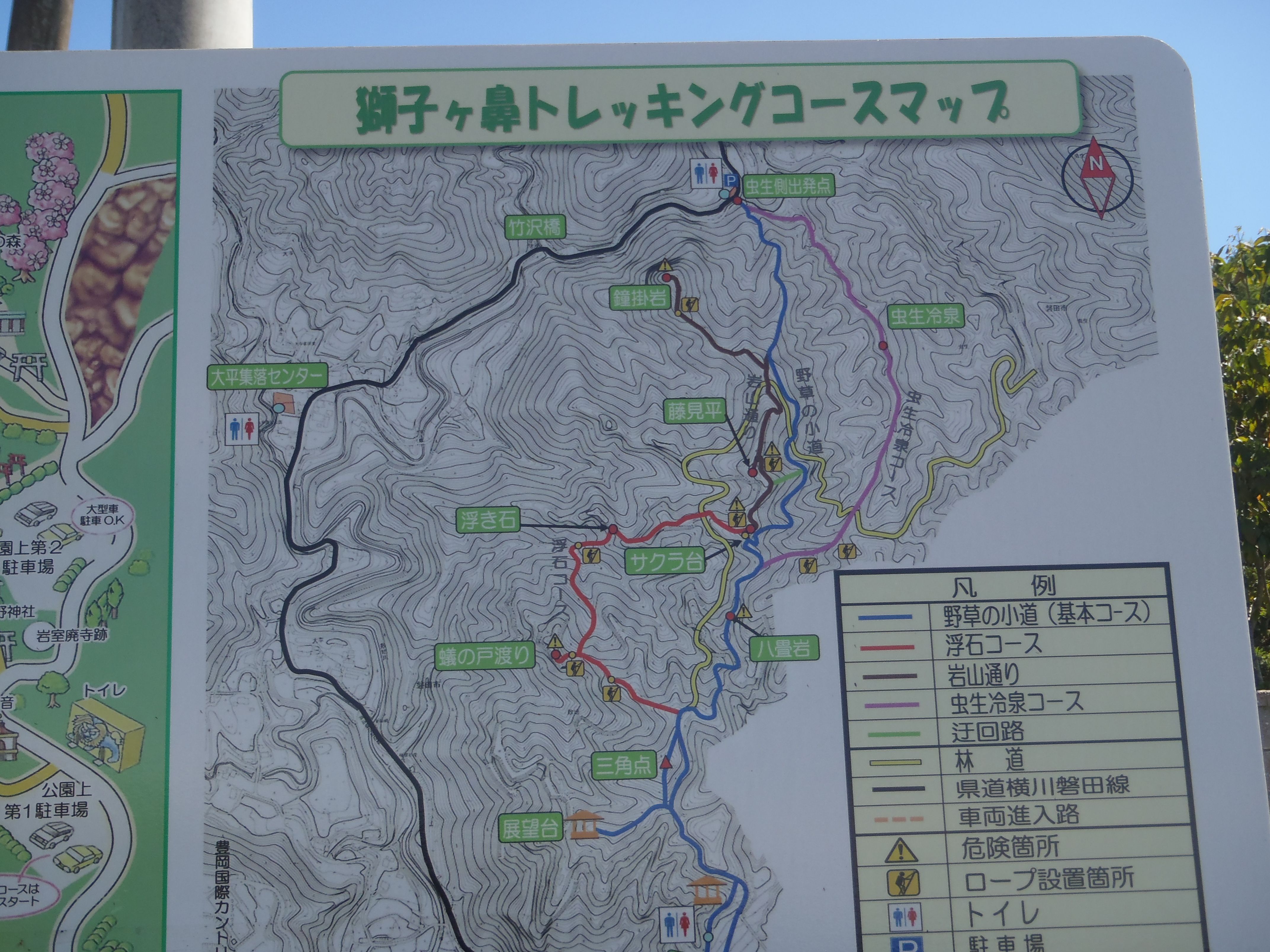 相変わらず残暑が厳しい!しかし暑いときに熱いものが体にとってはいいという~ならばと、前から気になっていた磐田市の獅子ケ鼻を歩こうと決めてでかけた。サラには無理とお留守番を頼み、女房とふたりだけのミニハイク(と思っていた)だ。外気温32℃。獅子ケ鼻公園の「公園上駐車場」。広いが暑い!コースの要所には案内標識があり迷うことはなかった。「自然ふれあい広場」を過ぎれば視界も開け、遠く浜松アクトタワーも望めた。東屋のある「展望台」もこの時期は名ばかり。木々の葉や夏草が視界を遮って展望はないも同然だ!次に向かった三角点(259.6m)を確認。林道歩きを外れて「蟻の戸渡り」へ向かう。たまに吹いて来る風は心地良かったが~スリリングな「蟻の戸渡り」から豊岡国際カントリークラブの先に浜松方面を見る。「蟻の戸渡り」から沢に降りたら登り返して「浮石」へ。ここまで来るだけで大汗をかく。ミニハイクなどととなめてかかったのは大間違いだった!未舗装の荒れた林道を横切って「サクラ台」。展望は良い!そこから南下して八畳岩に着く。予定では、「鐘掛岩」「藤見平」まで足を延ばすつを歩いてもりだったが蒸し暑さと急なアップダウンに今日は、ここまででギブアップ!林道に降りて往路を戻る。「自然ふれあい広場」から駐車場に戻る。夏の最中に登る山ではないことを痛感した!!