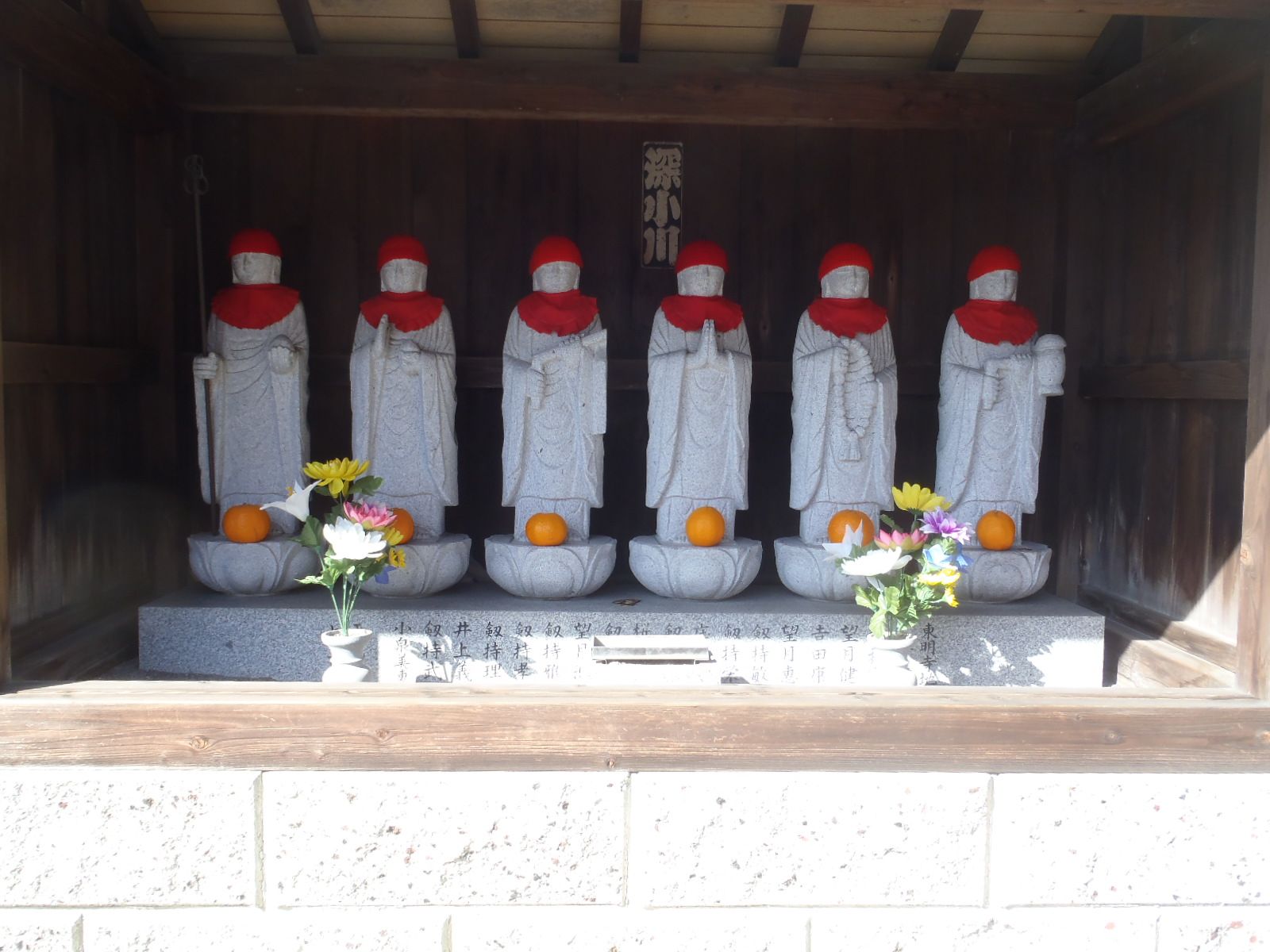 寺の入口の六地蔵さん、幼稚園の送迎バスの停留所が前にあるので