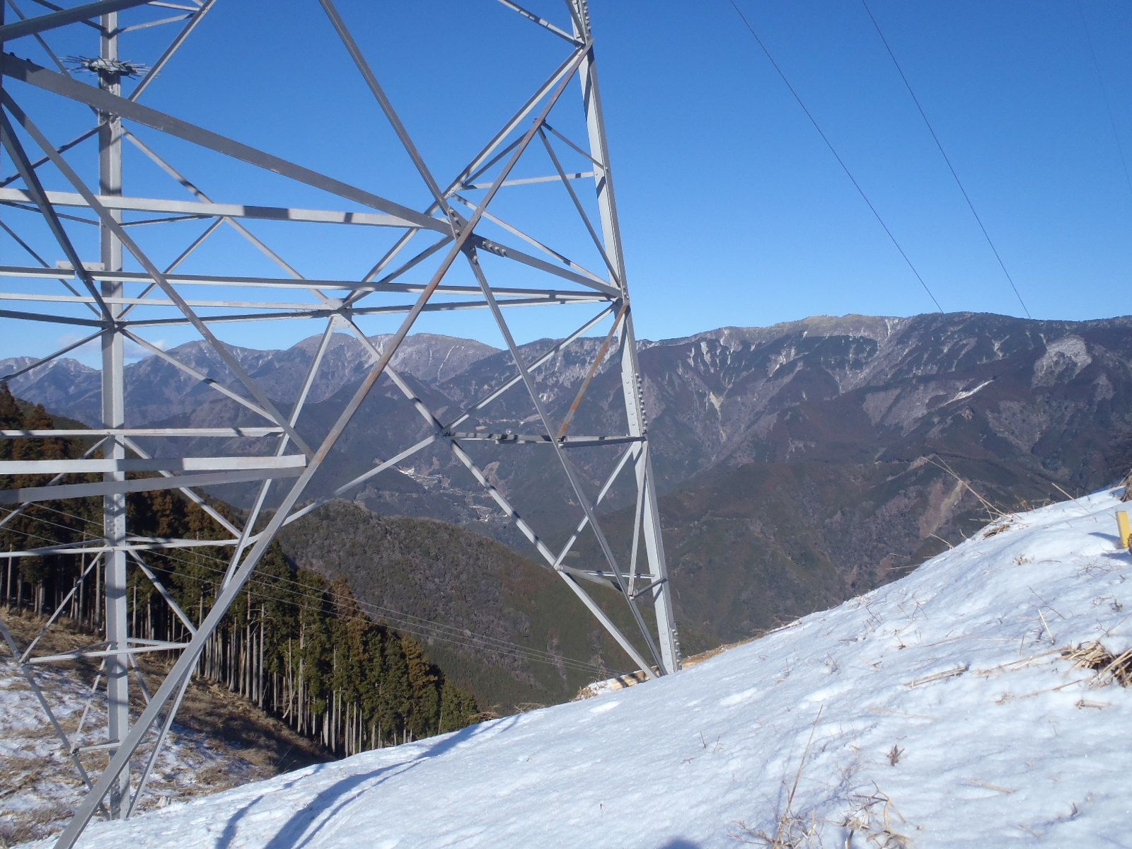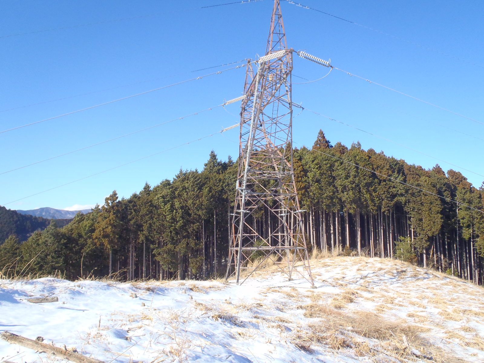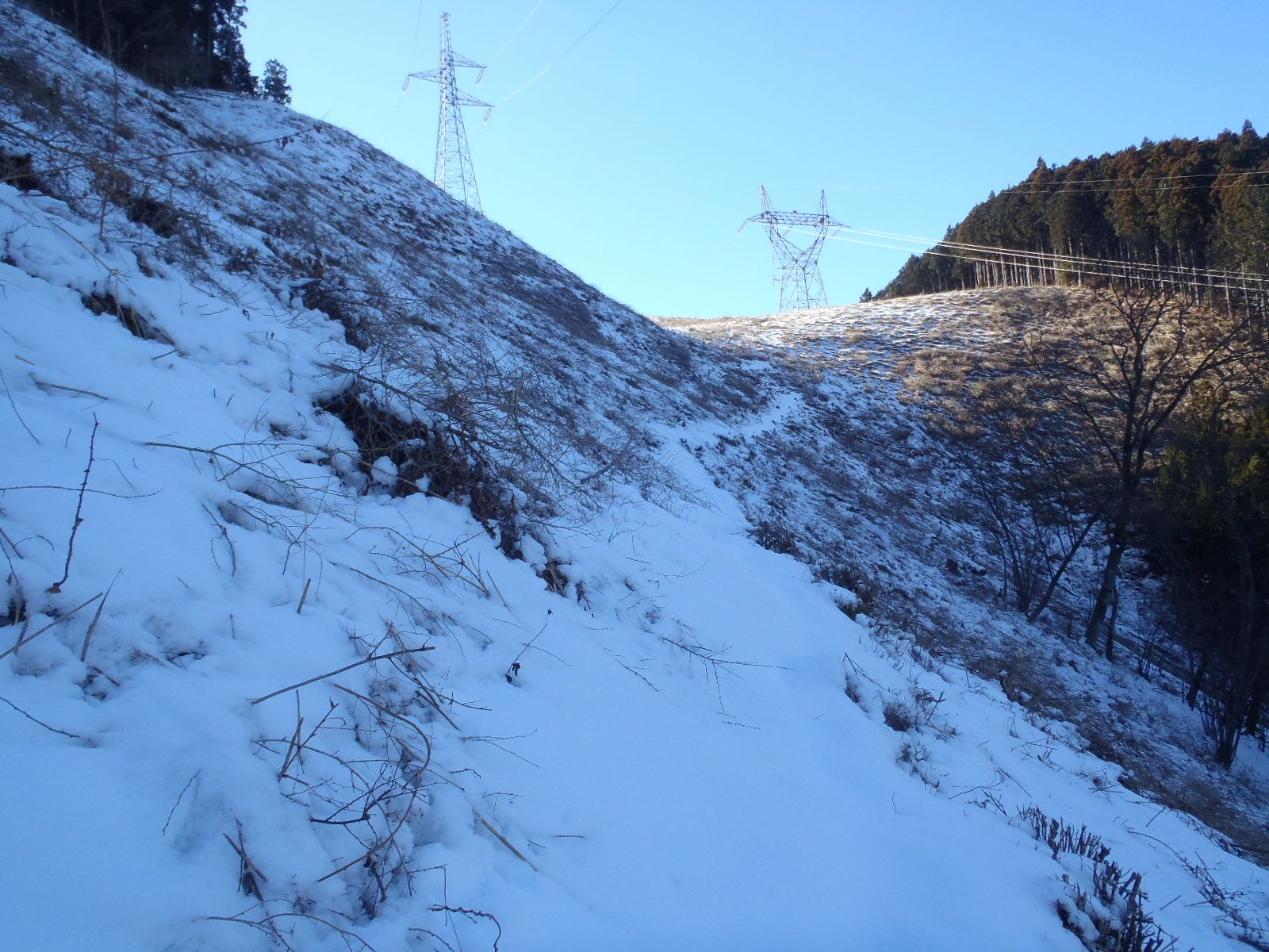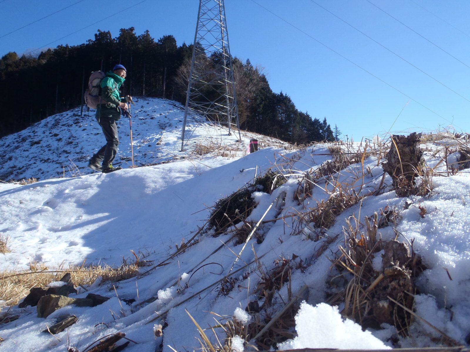 鉄塔が2基立つ主稜線は近い!雪は軽くクラストしているので歩きやすかった。