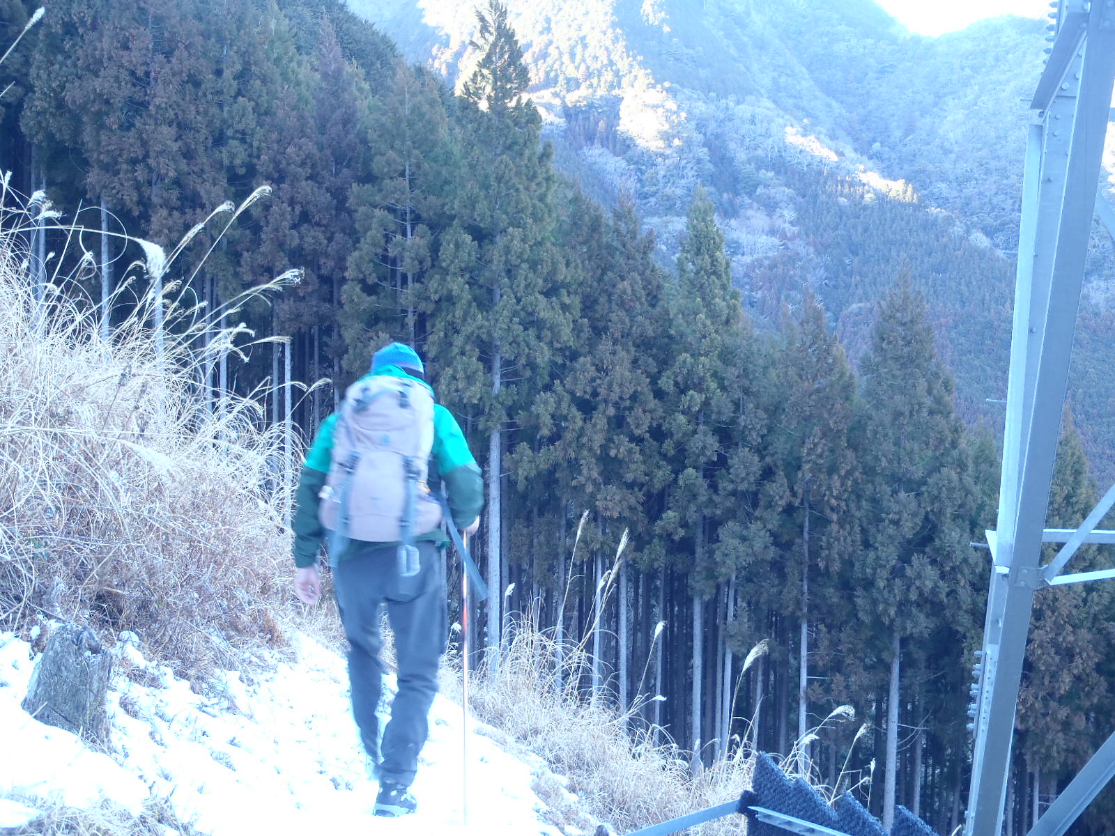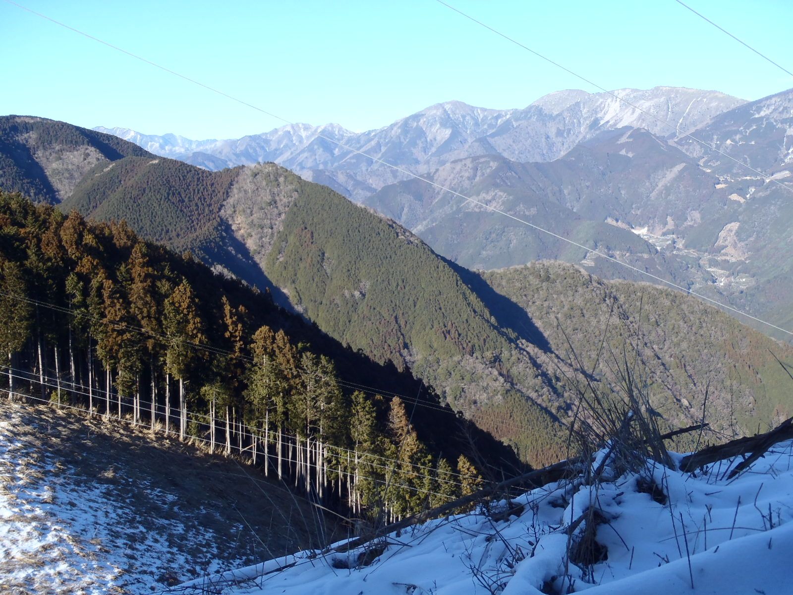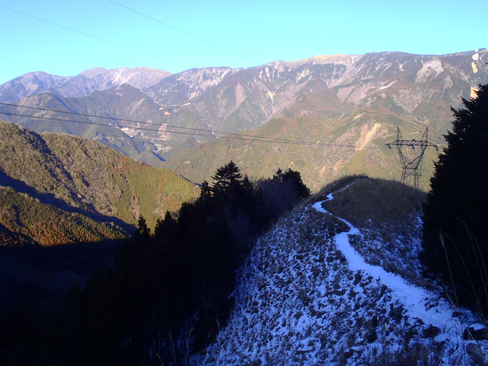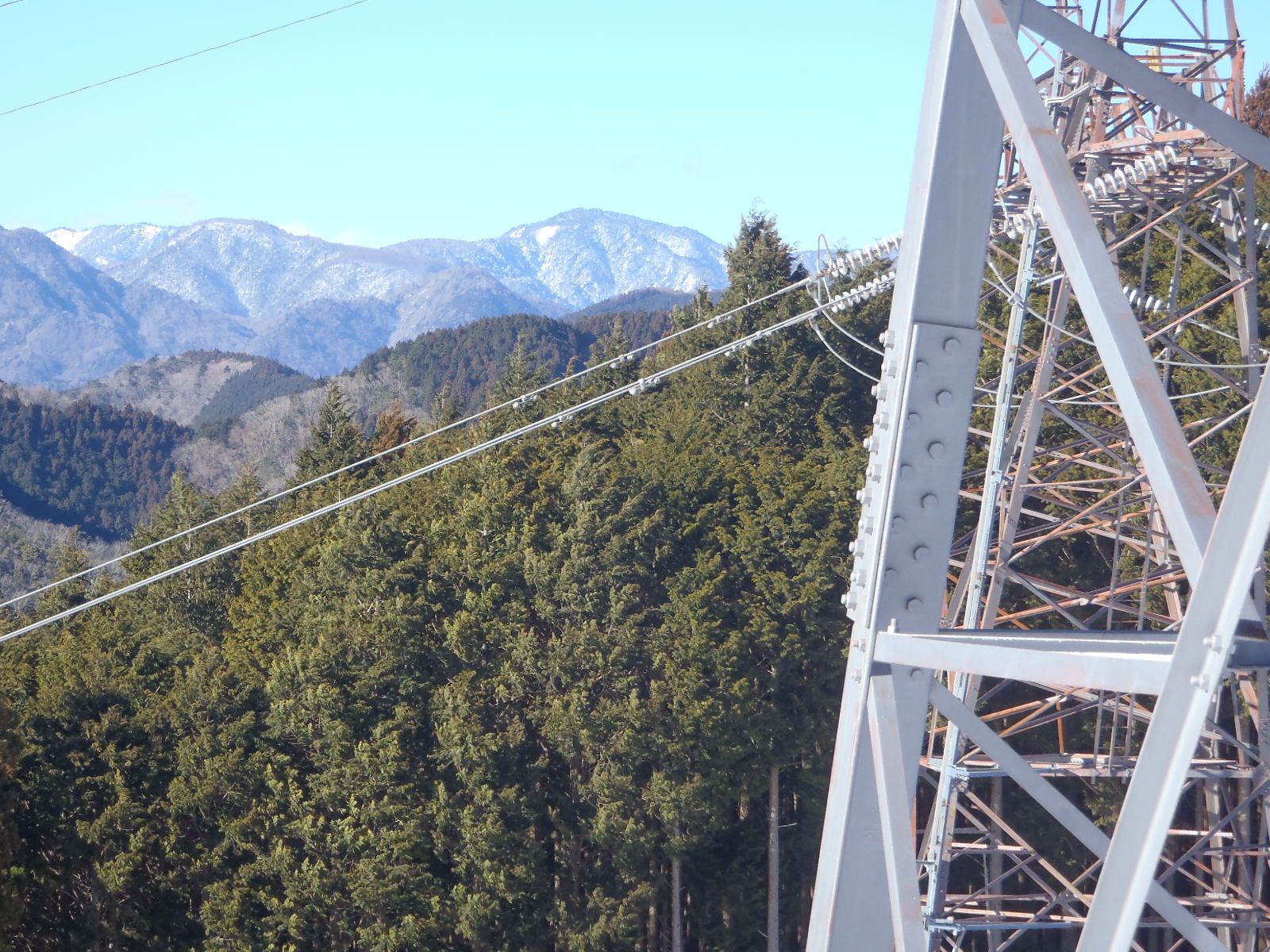 鉄塔が2基立つ主稜線は近い!雪は軽くクラストしているので歩きやすかった。