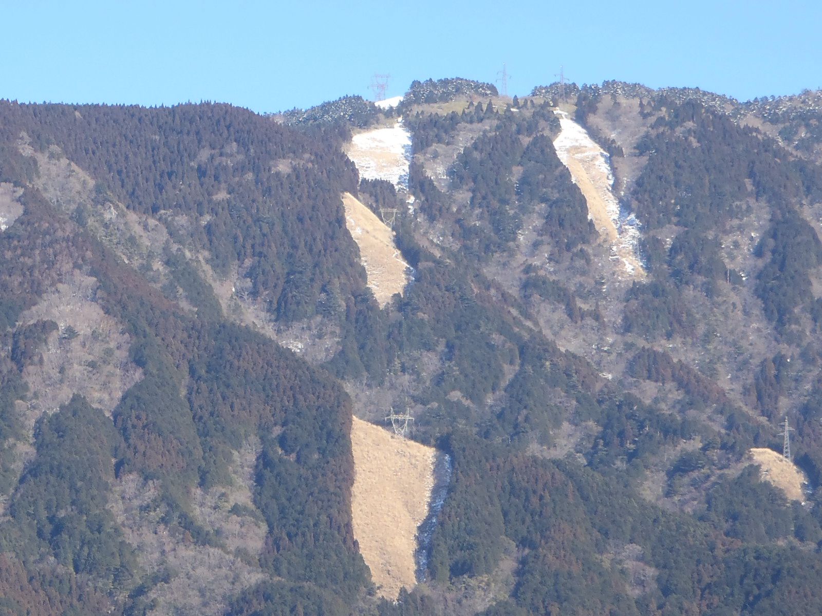 送電線の鉄塔が立つ浅間原、中腹から上部は雪ですね!