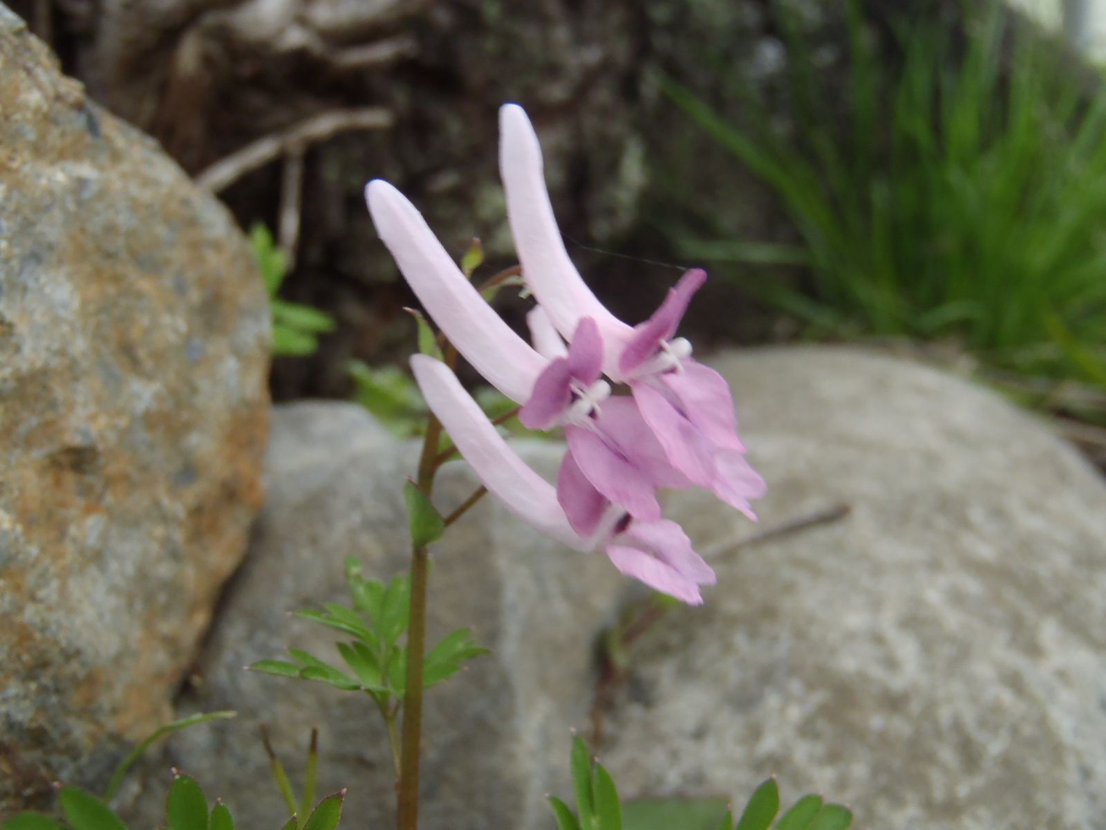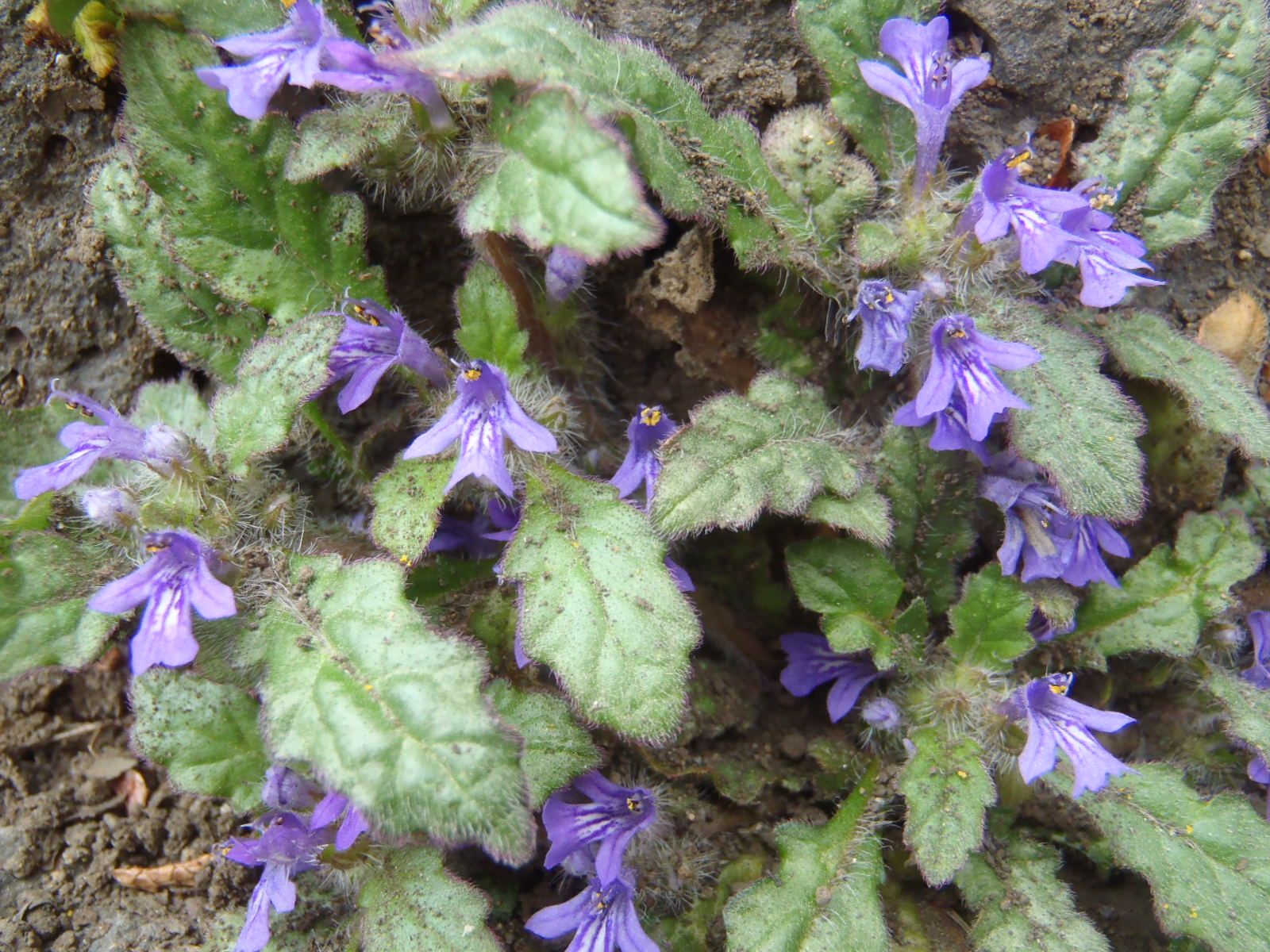 階段の隙間で張り付くように咲くキランソウ(シソ科)