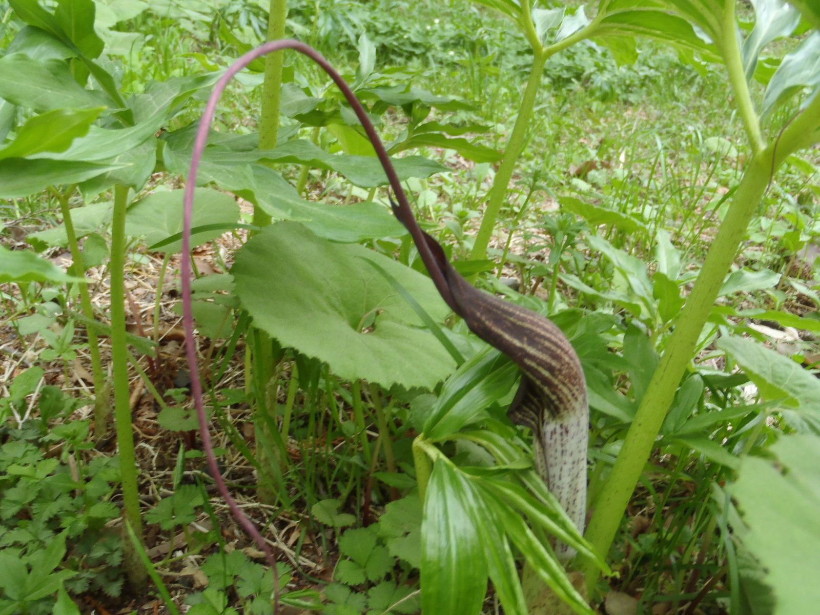 ウラシマソウ(サトイモ科)の奇異な花姿あり。
