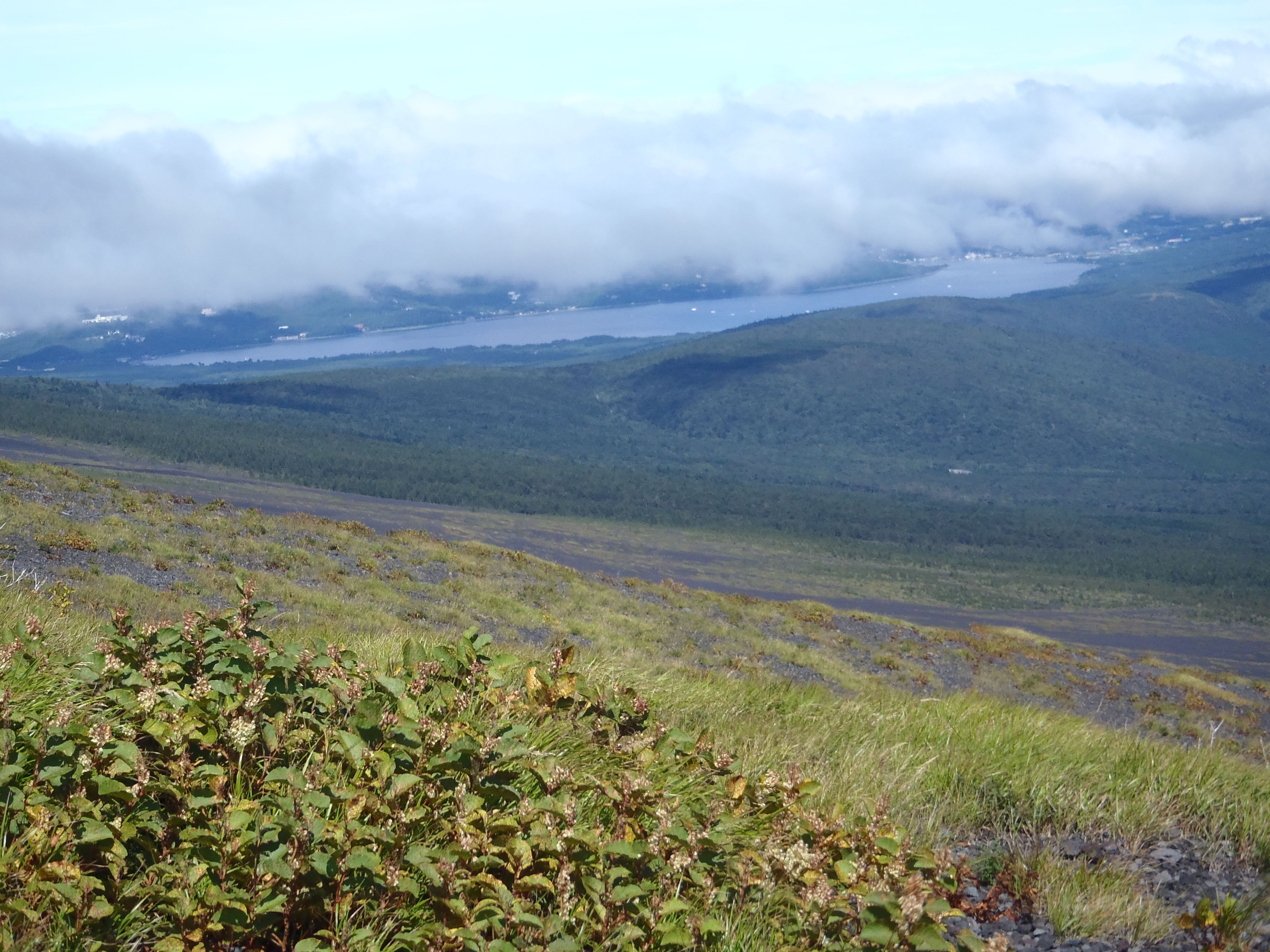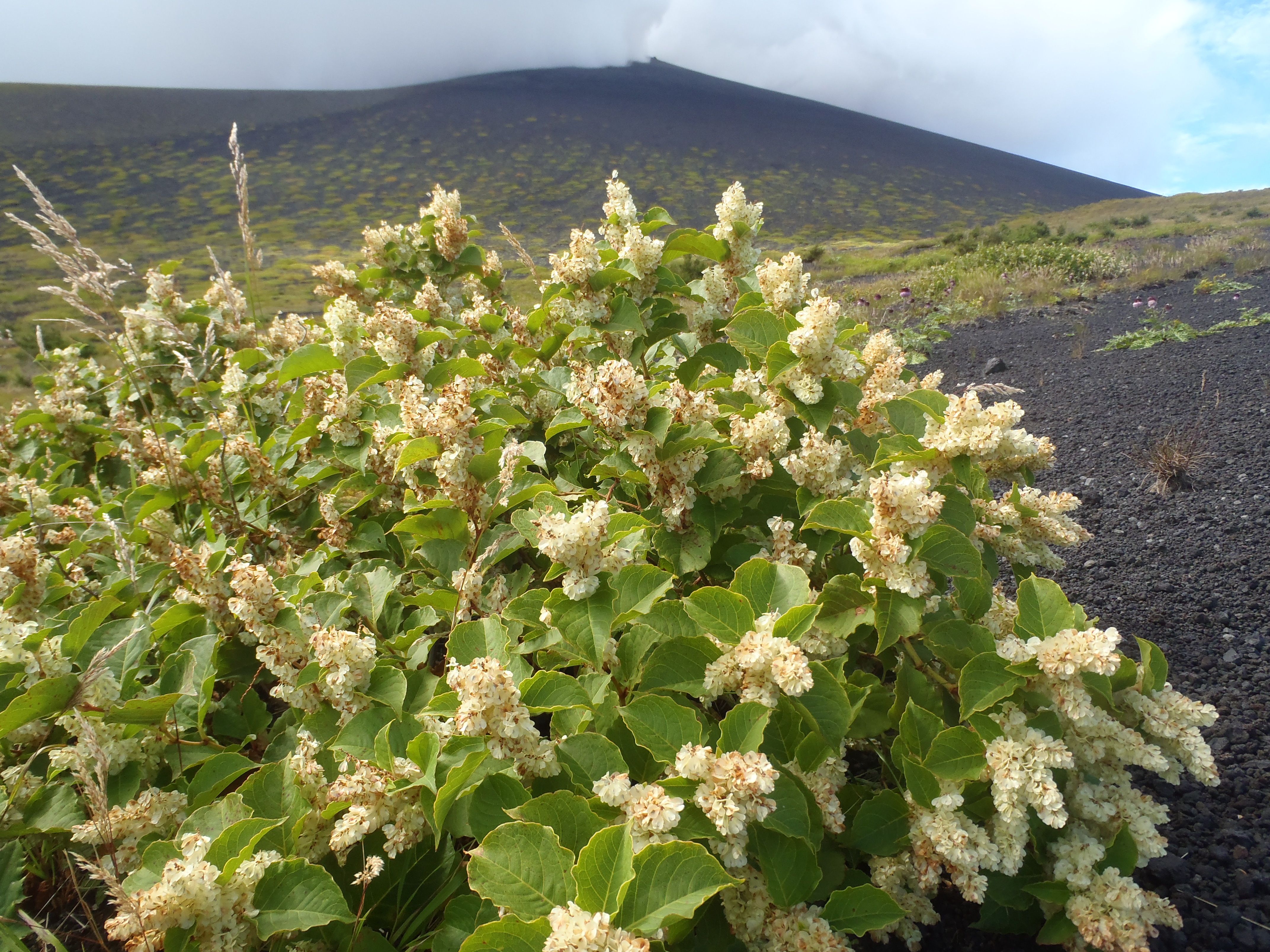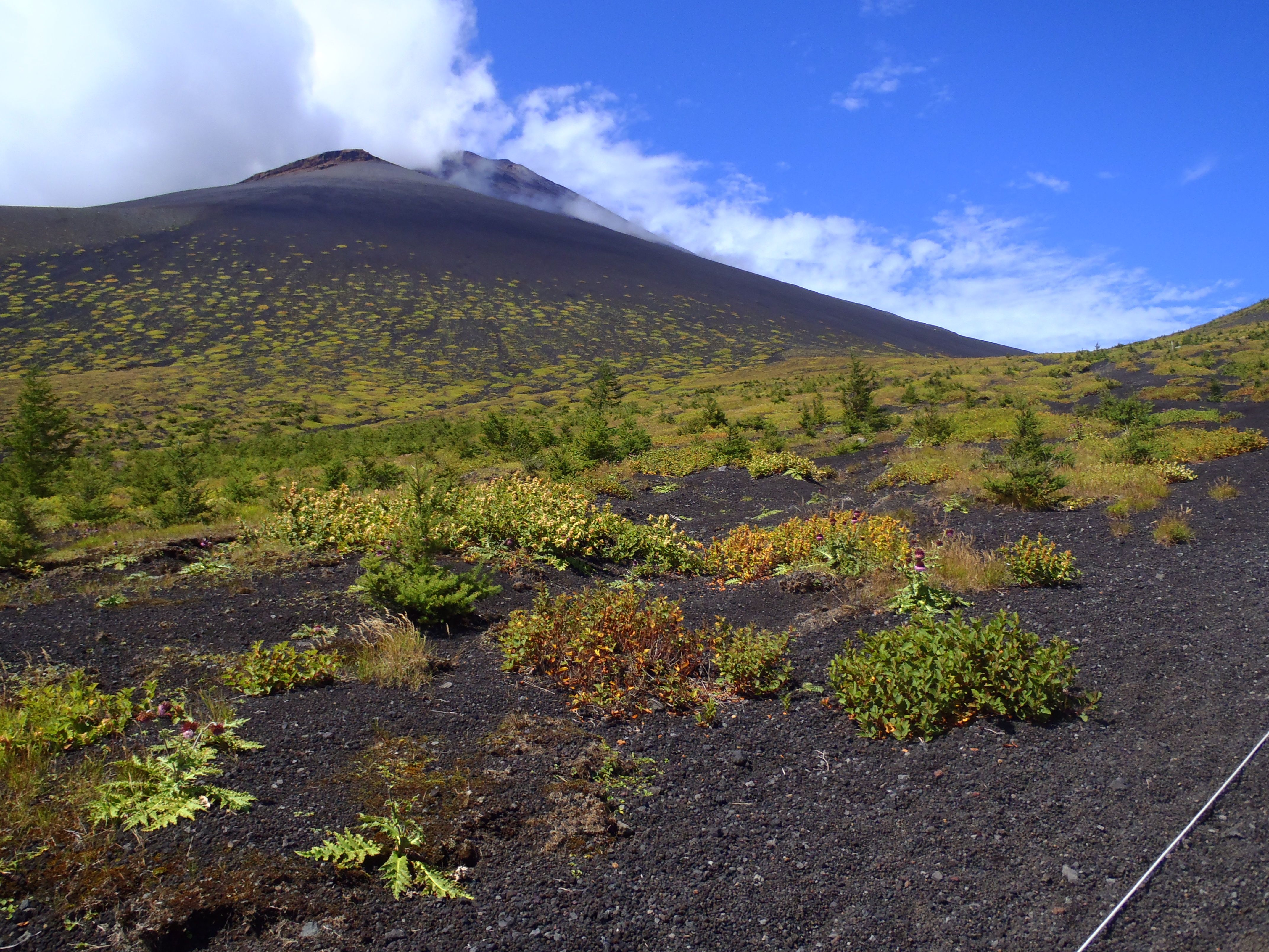 山腹に点在するのはパッチ。厳しい高山で生き残るためオンタデやイタドリ、ヤマホタルブクロなどが