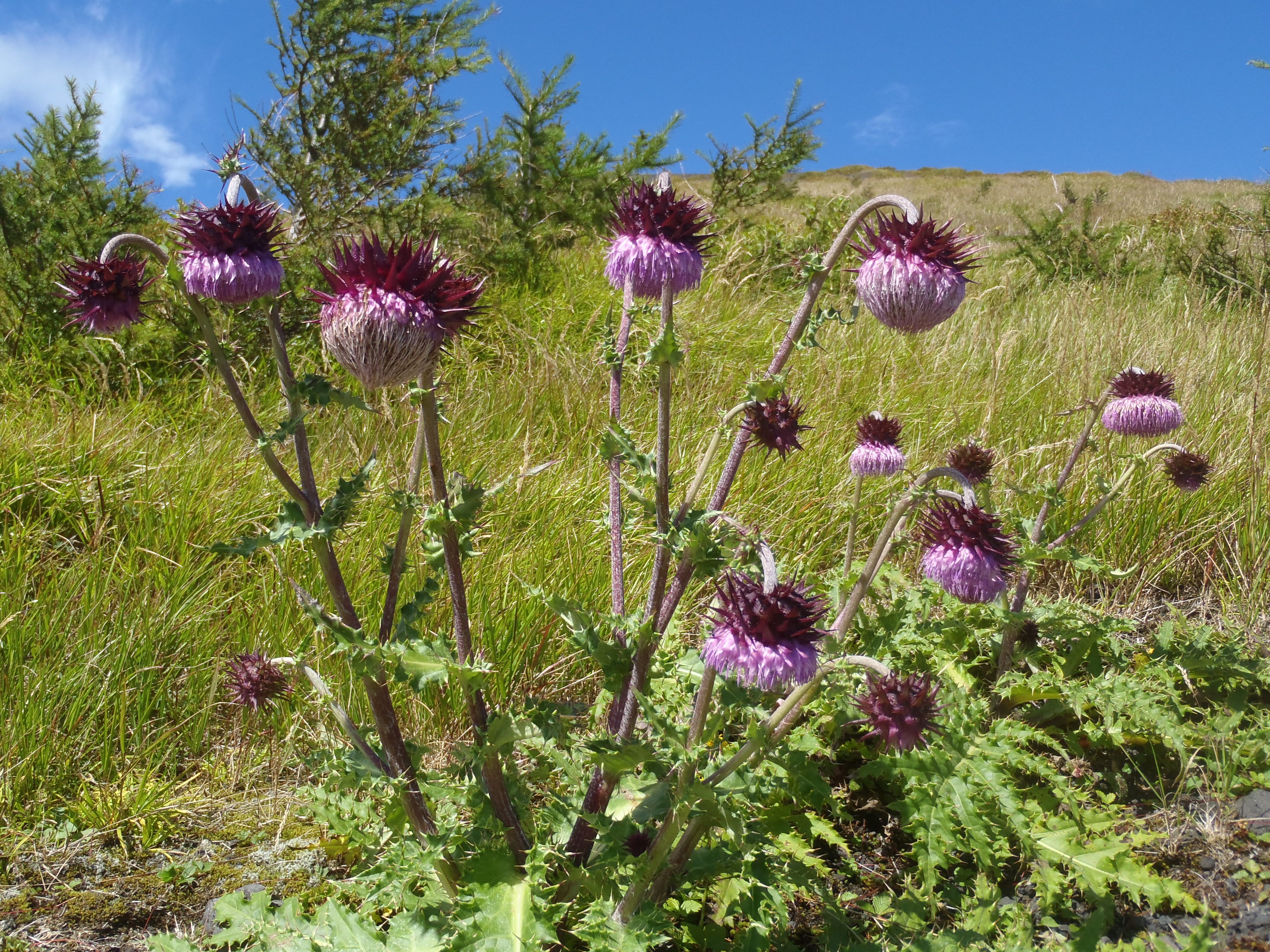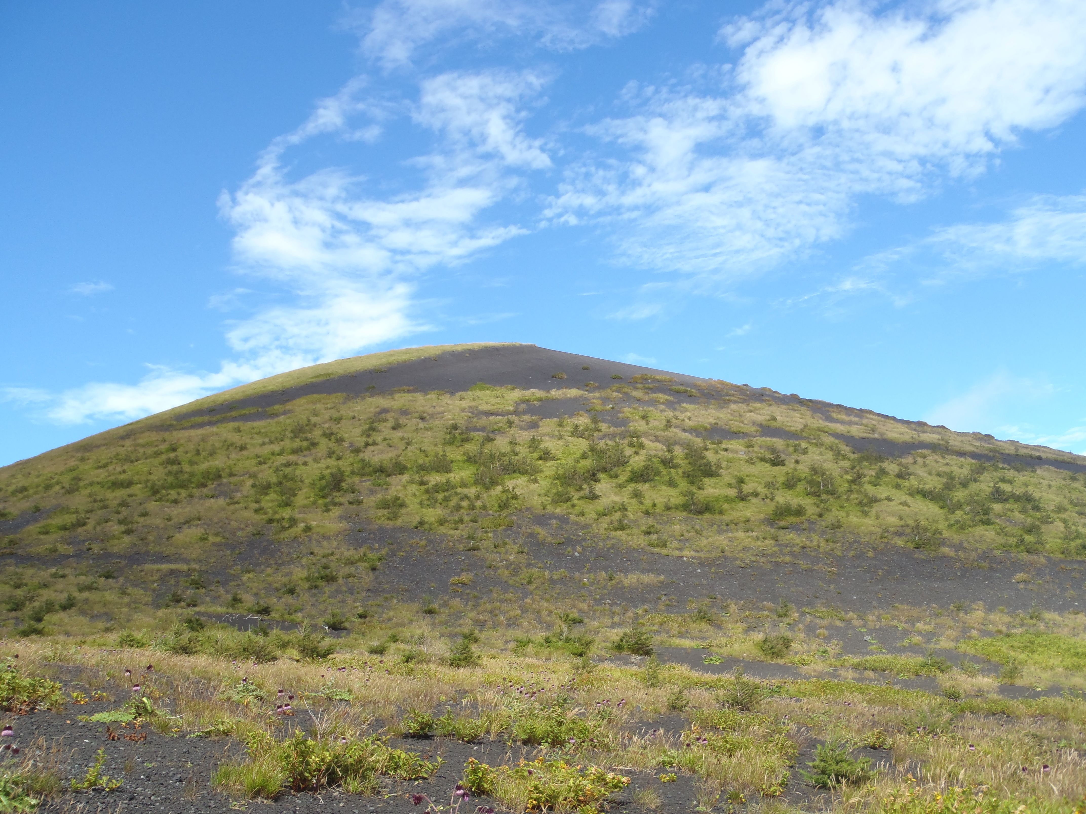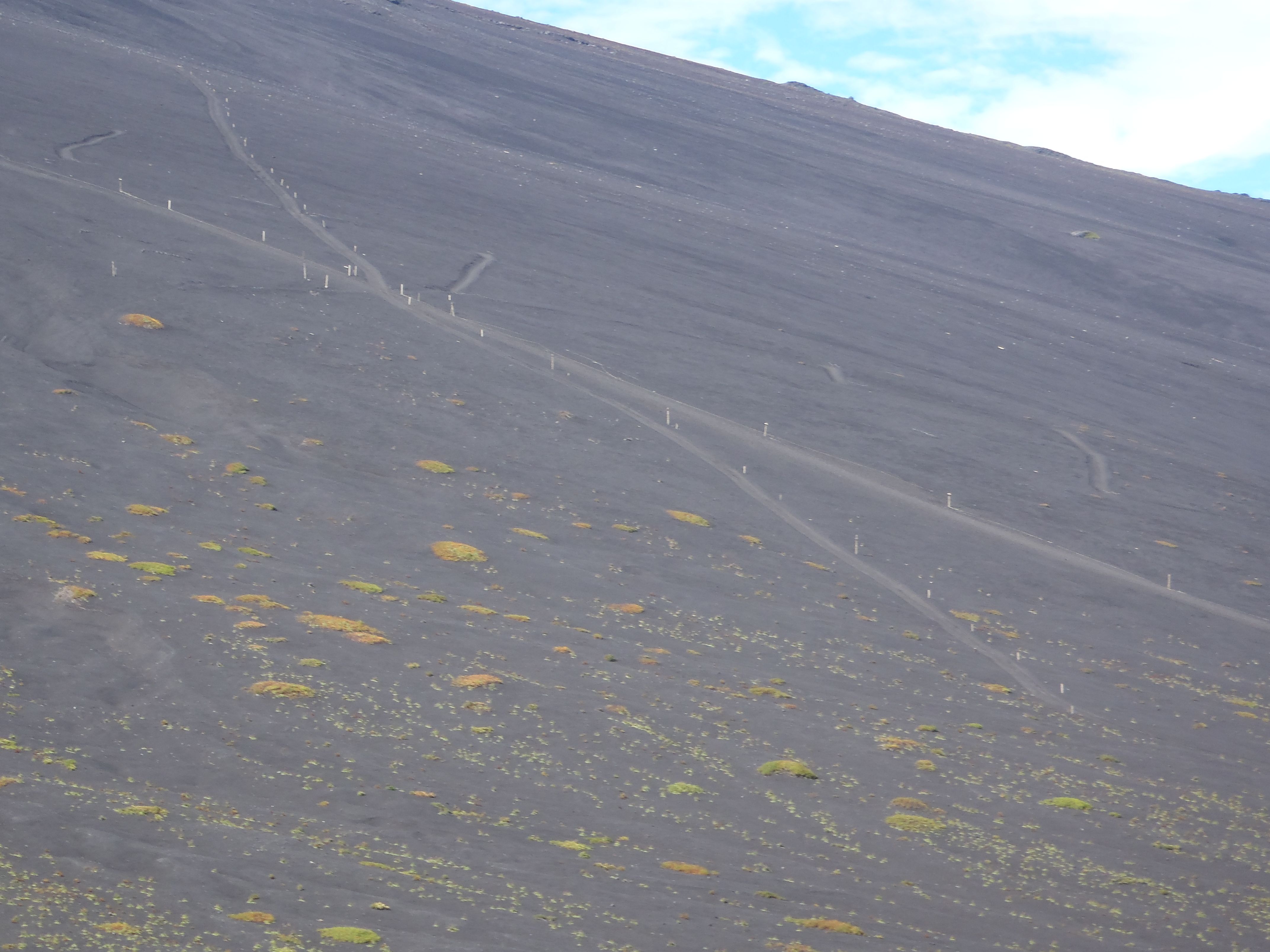 山腹に点在するのはパッチ。厳しい高山で生き残るためオンタデやイタドリ、ヤマホタルブクロなどが