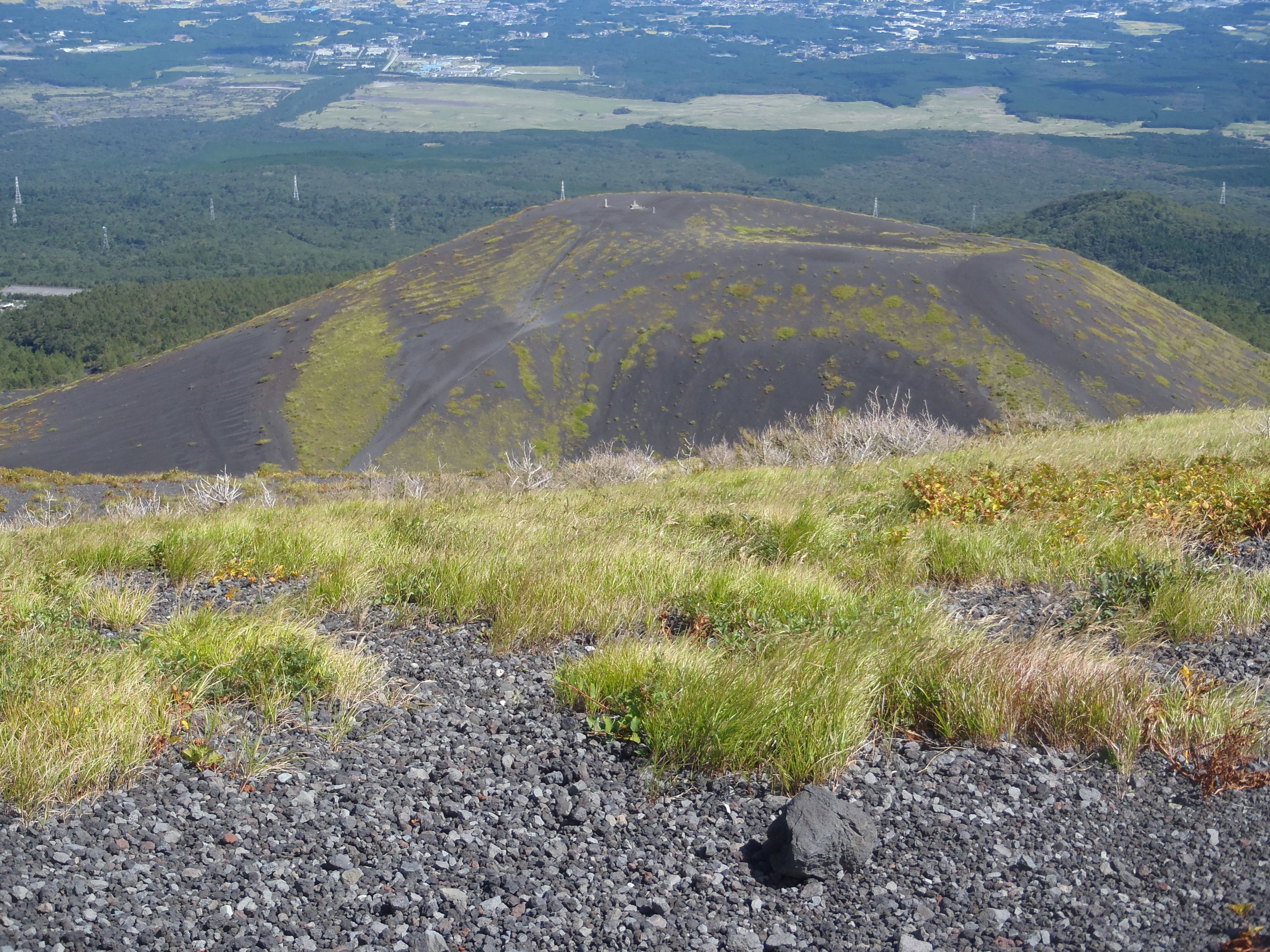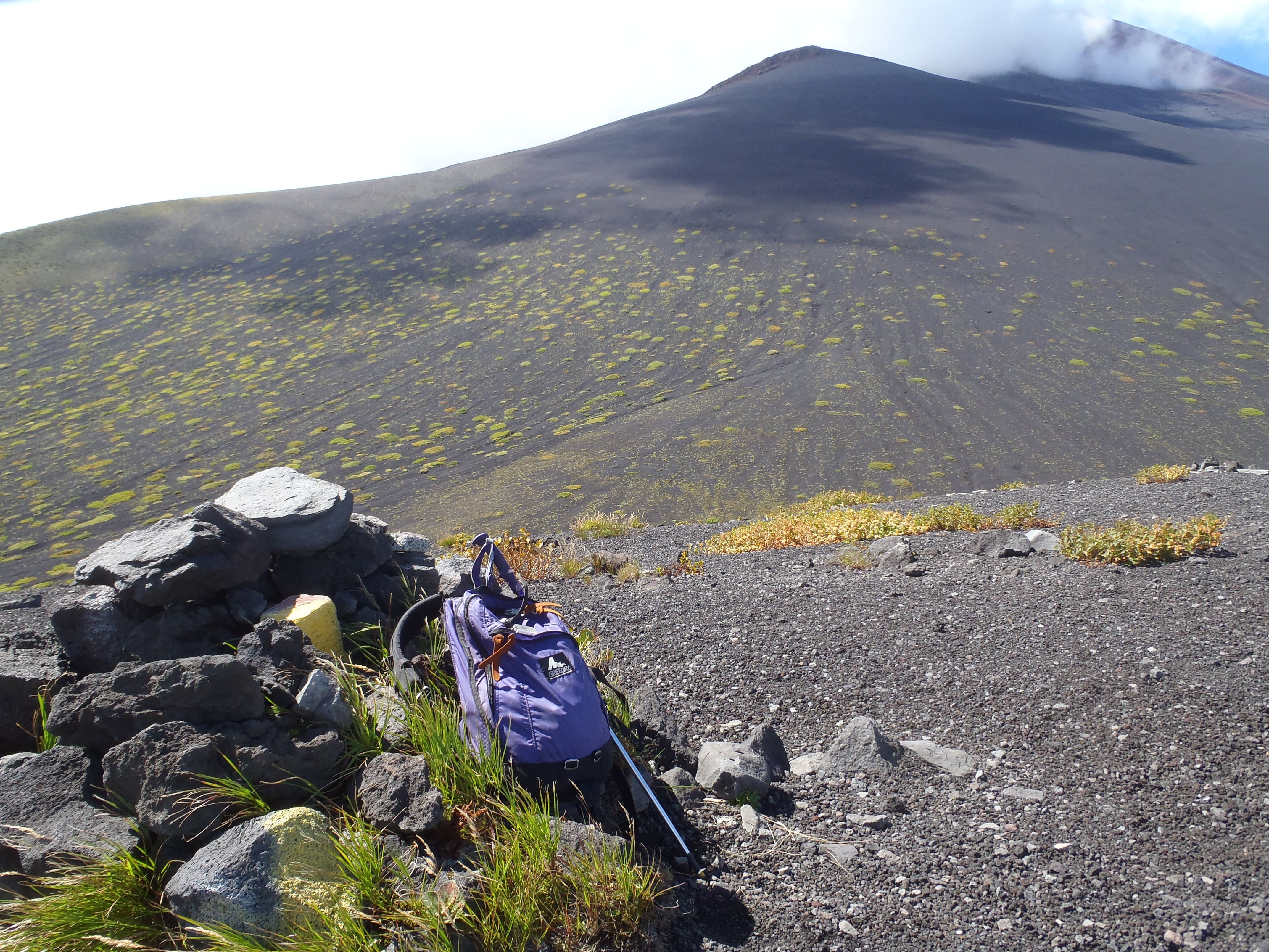 宝永山と、後方の雲に隠れた富士山頂を見上げる。雲の流れが早い。風が強くて帽子が飛ばされそうだ~