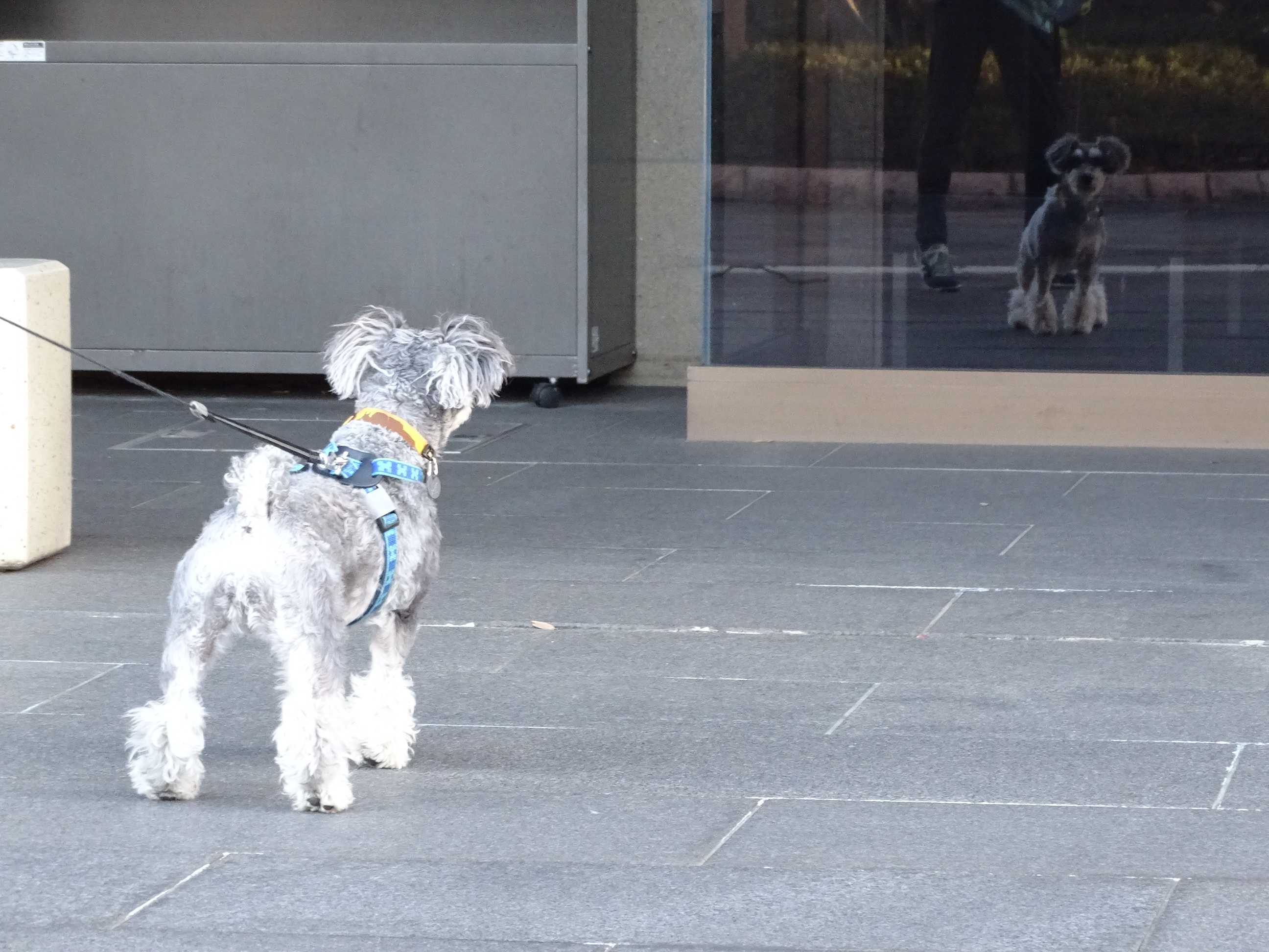美術館のガラスに写る自分を見て怪訝な様子、ずっと見入っています。いつものことです~ウィンク