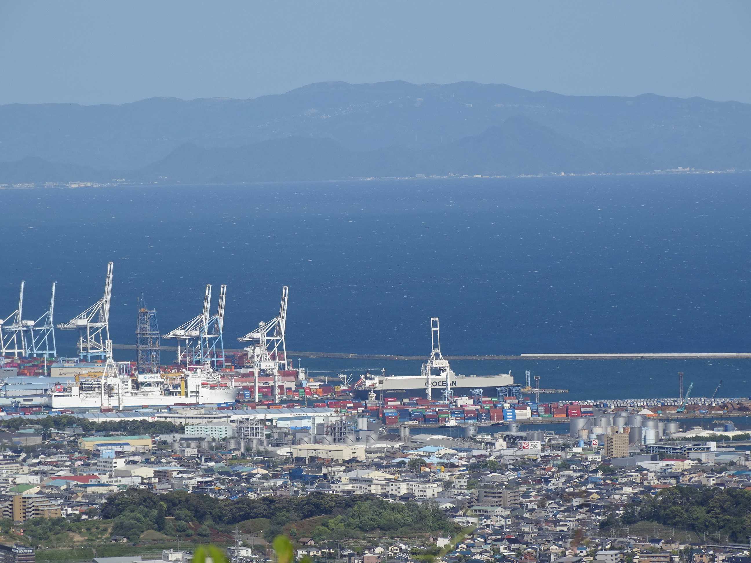清水港から駿河湾を隔てた先は、伊豆半島。達磨山や天城山が連なっています。