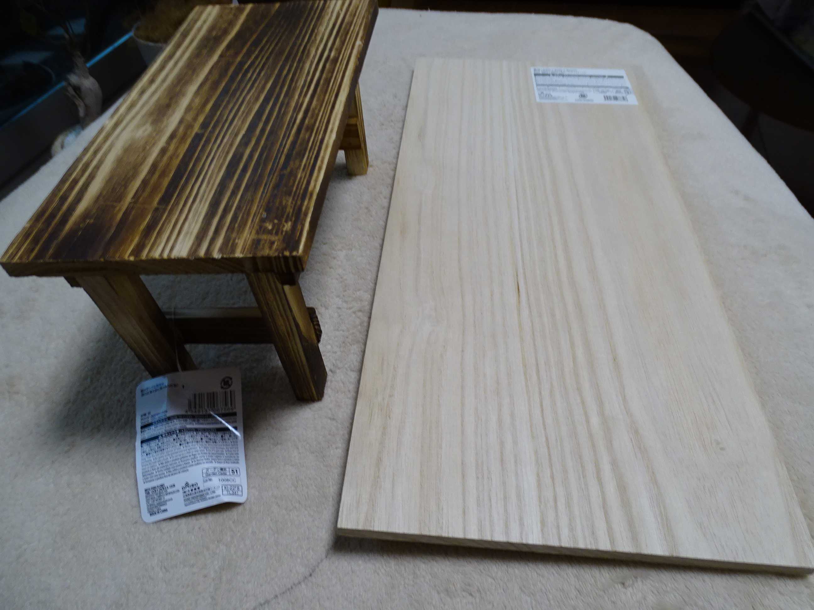 焼杉で出来たテーブル型花台1台と、30cm×50cm×0.9cmの木製板1枚。