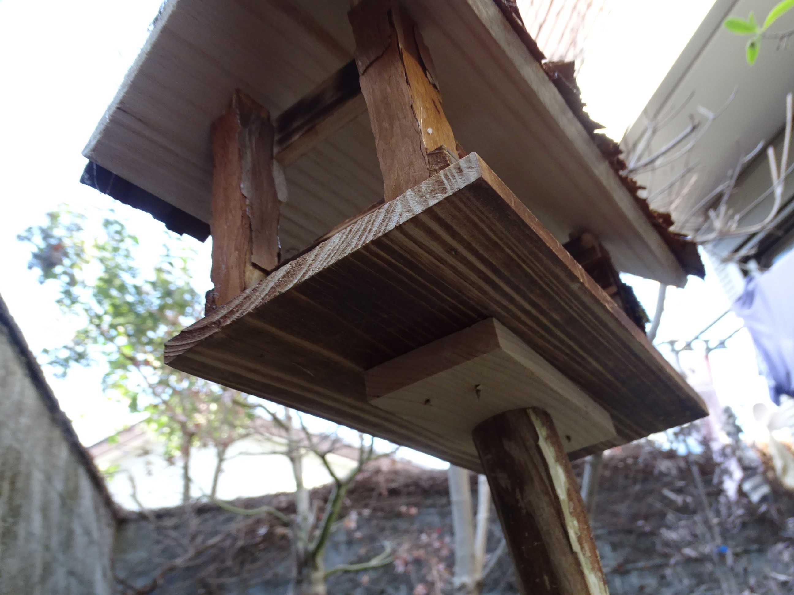 まず、支柱となるこん棒の頂上部を平らに切って、地中30cmほど打ち込み、そのてっぺんに正月で御用済みになったカマボコの板を打つ。そして、花台を逆さにし、中心部をカマボコ板の上に釘で打ち込む。あとは、あらかじめ檜皮葺にしておいた屋根を接着剤と釘で打ち付けて終了。
