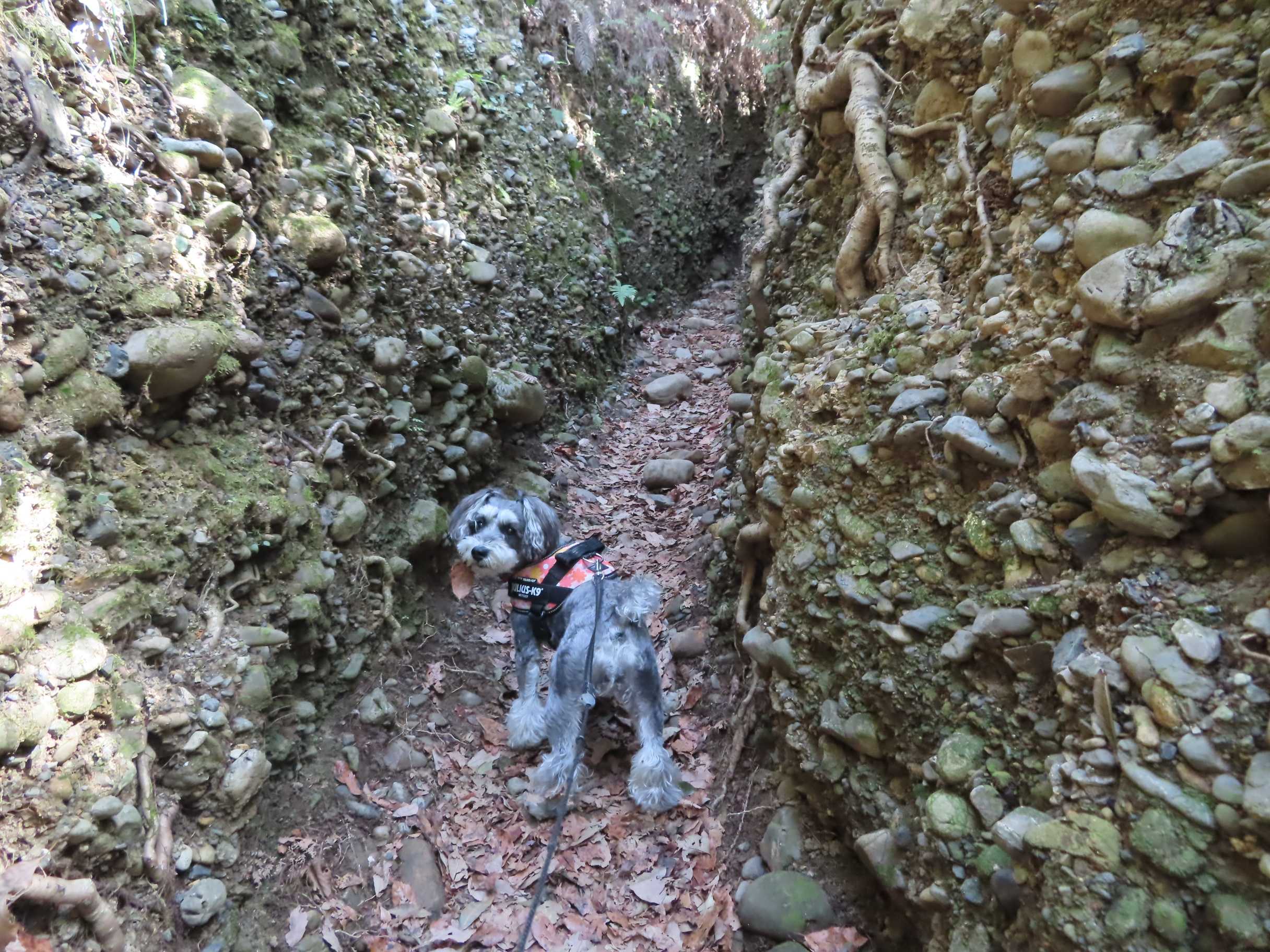 墓地の奥から登山道が始まります~すれ違いの出来ないほどの狭い切通しを抜けてしばらく歩き、いったん車道に出てからは、ゴルフ場に沿って緩やかな階段が続きます。途中、馬走(まばせ)への分岐を左に見送り、左側に日本平ホテルを見ながら、