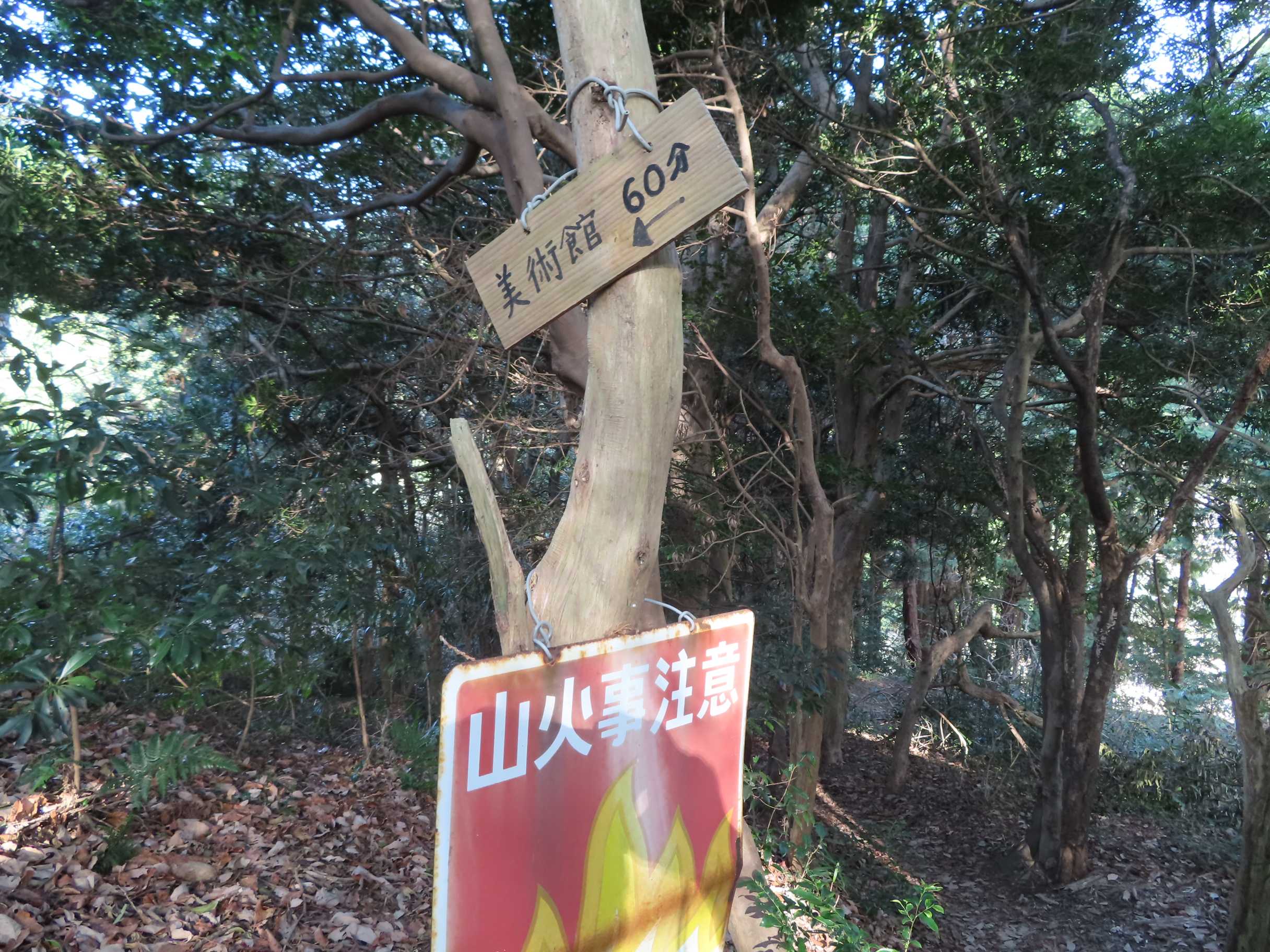 小ピークのここで右折し、往きには歩かなかった稜線を辿って歩きました。トレイルランニングを楽しむランナーとなんどもすれ違い。ところで、このホーロー引きの「山火事注意」の看板もどこか懐かしいですね!最近はほとんどみることないので。