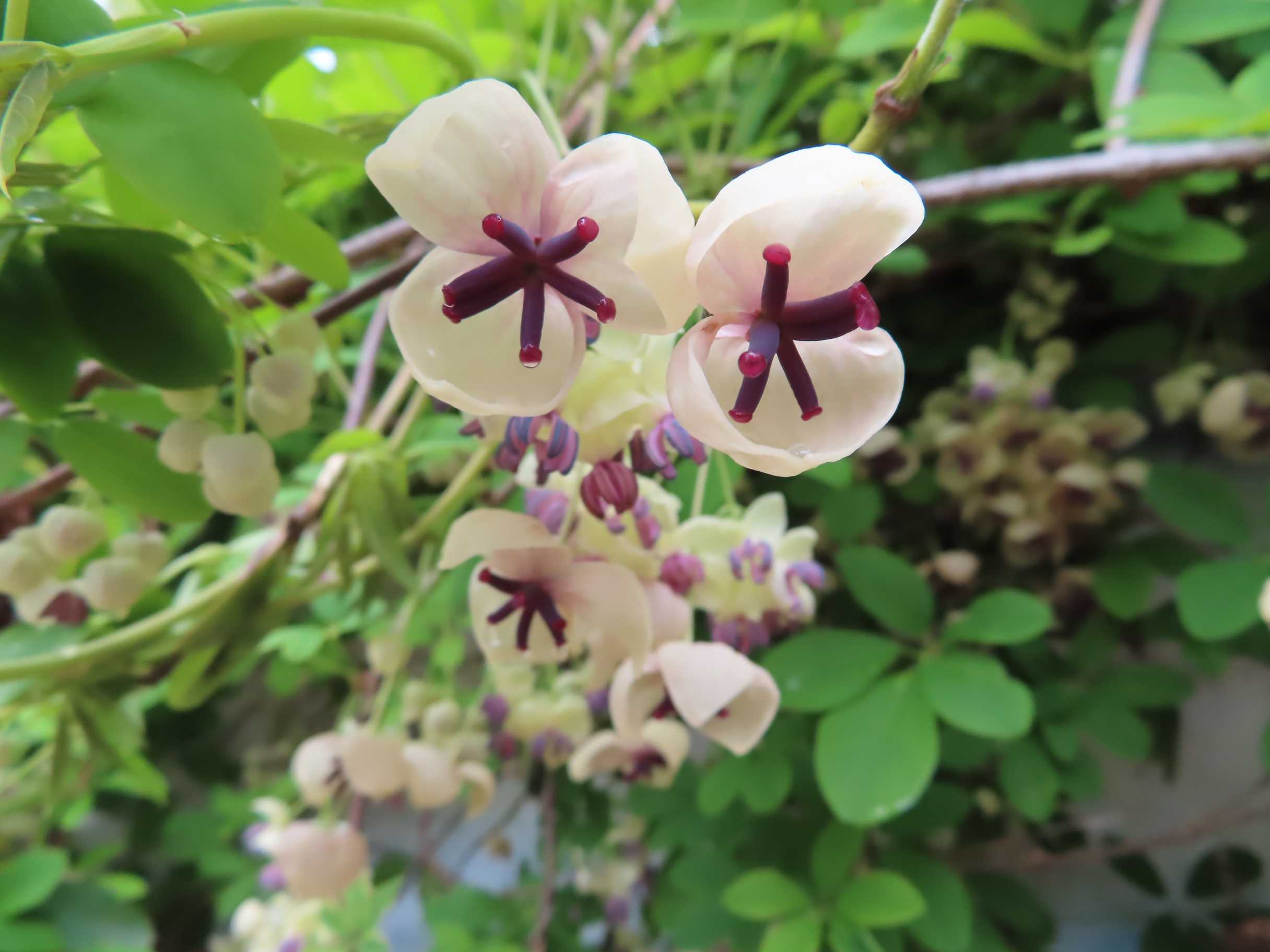 この時期、山道沿いにアケビ(アケビ科)の花をそこかしこで見る~実が有名だがこの春の花もたいへん印象的である。ツル性の木で、手前の大きいのが雌花で下に見える小さな房状になったのが雄花だ~