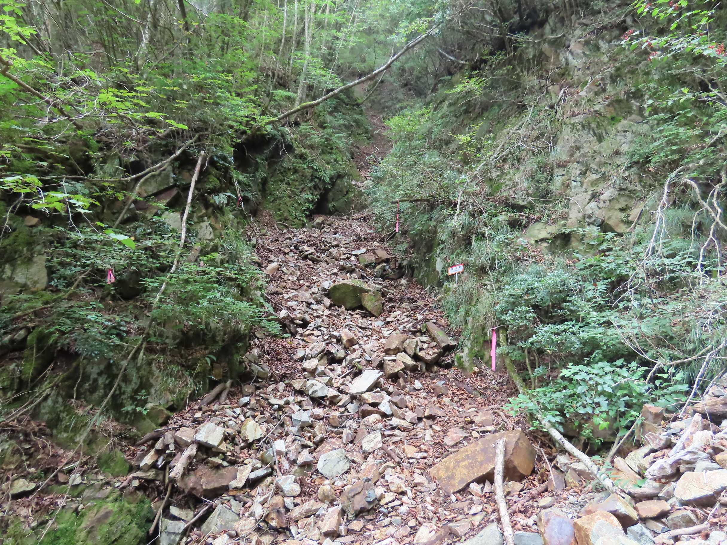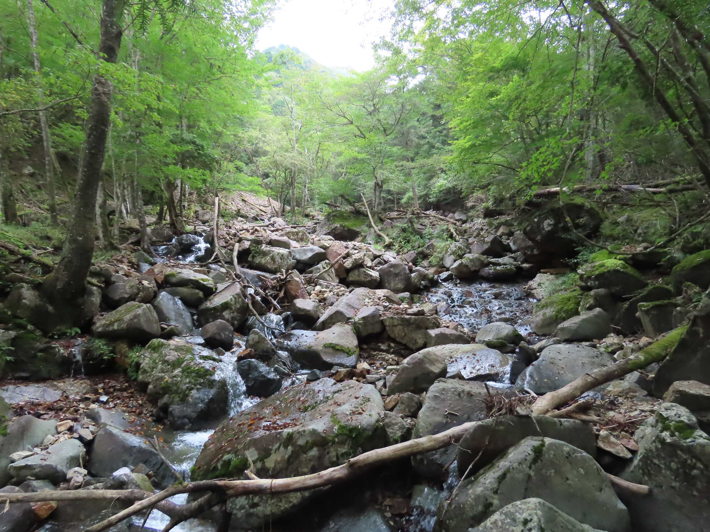 左岸から右岸に渡り返すと沢は河原に近い、段差のすくない沢に変わる~