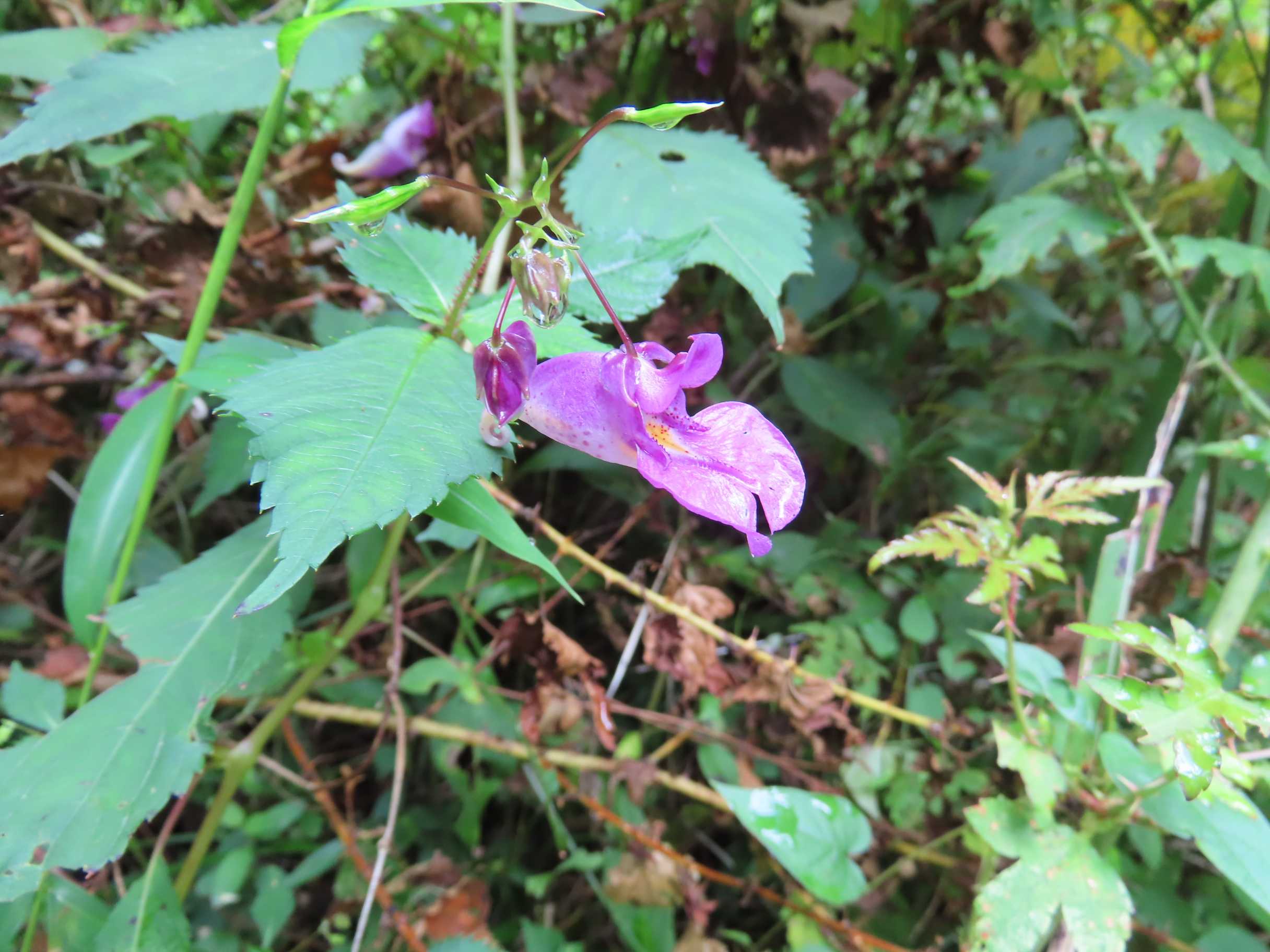 駐車場からしばらく続く林道脇に咲く秋の花、黄色のテンニンソウ(シソ科)と赤いミズヒキ(タデ科)~