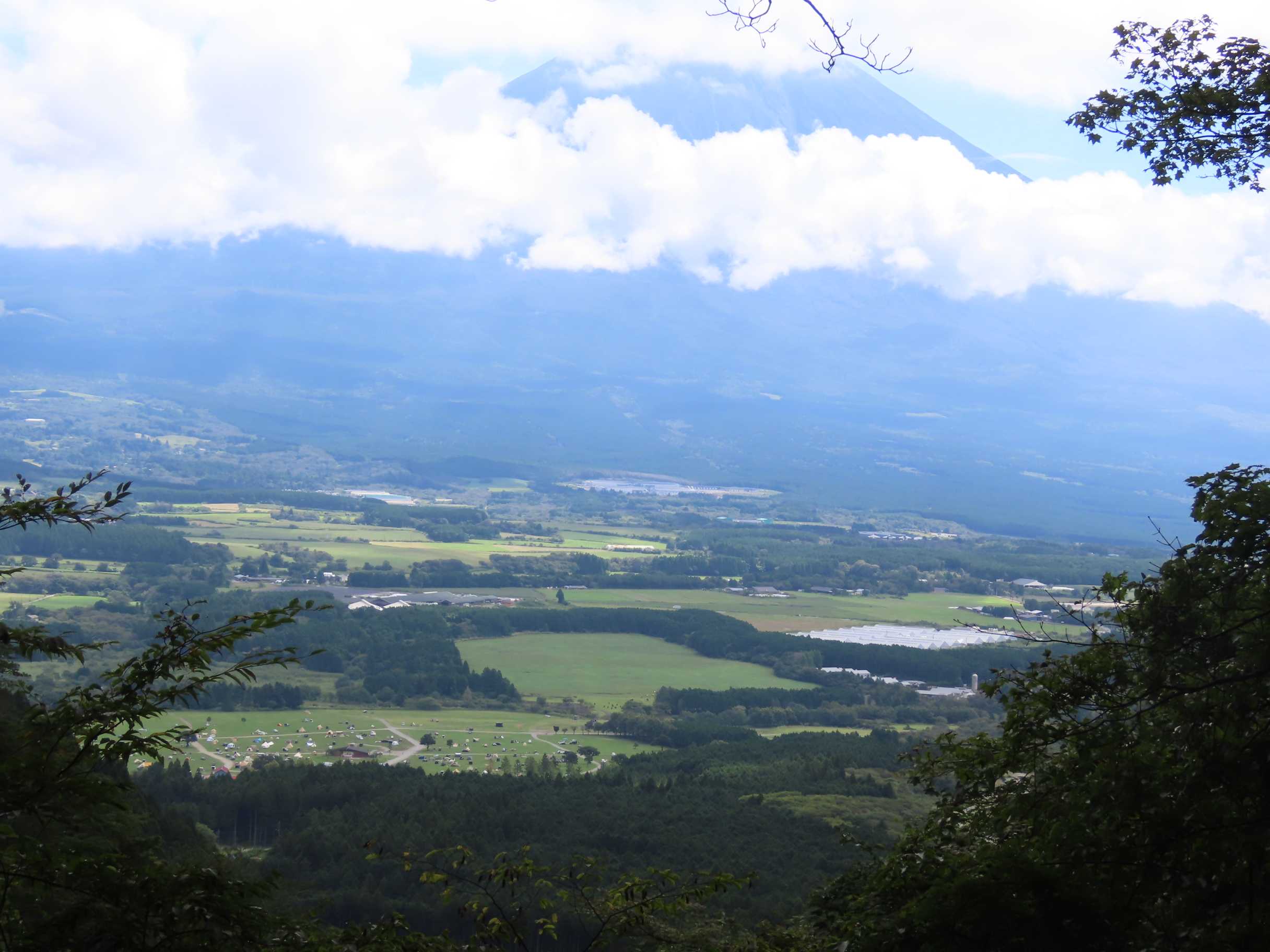 本コースで唯一、富士山が望める箇所がある。あいにく雲に覆われて全貌は見えないが、眼下に