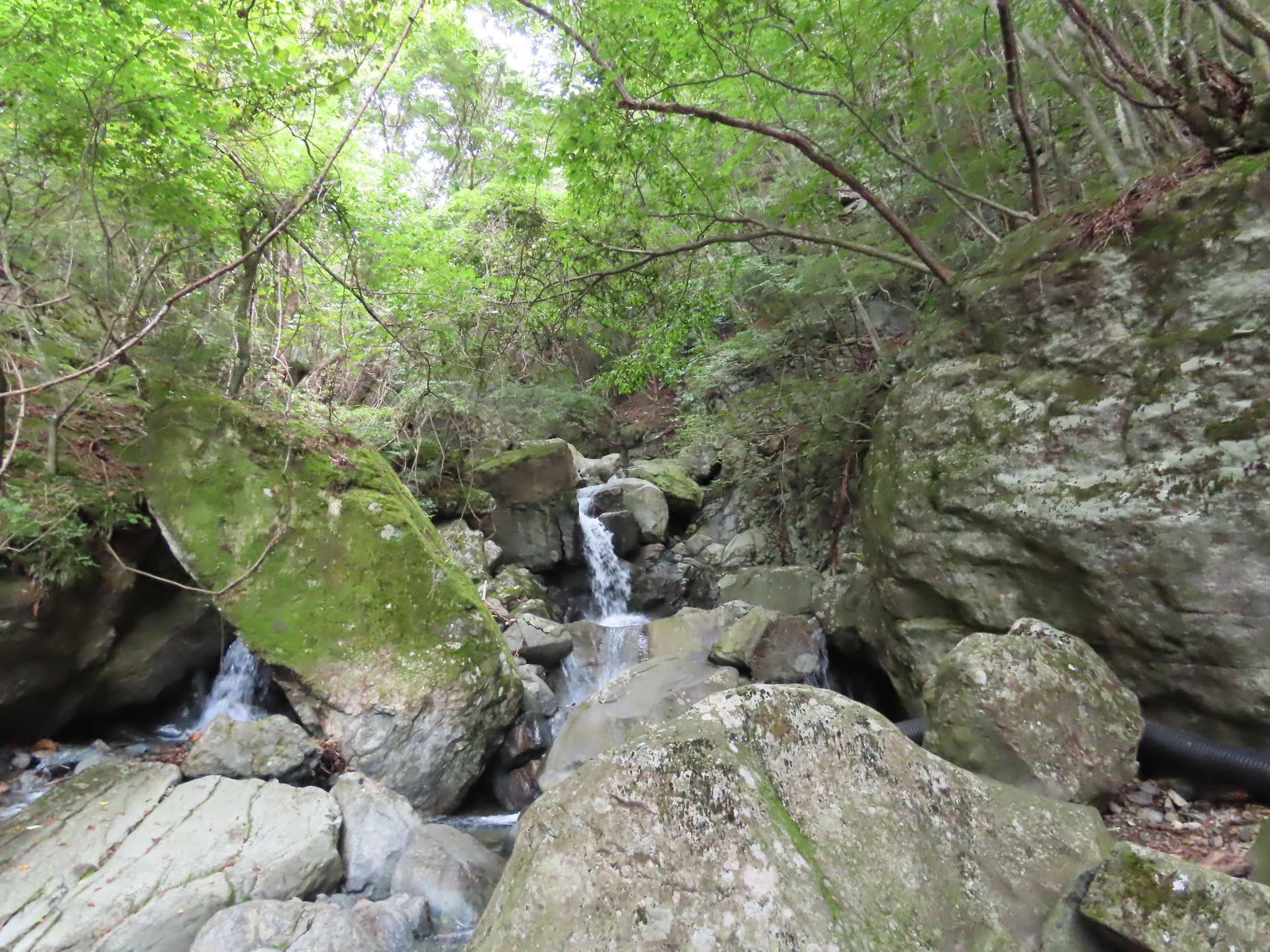 金山沢の源頭付近に降りて~(正面に水量の少ない小滝あり)