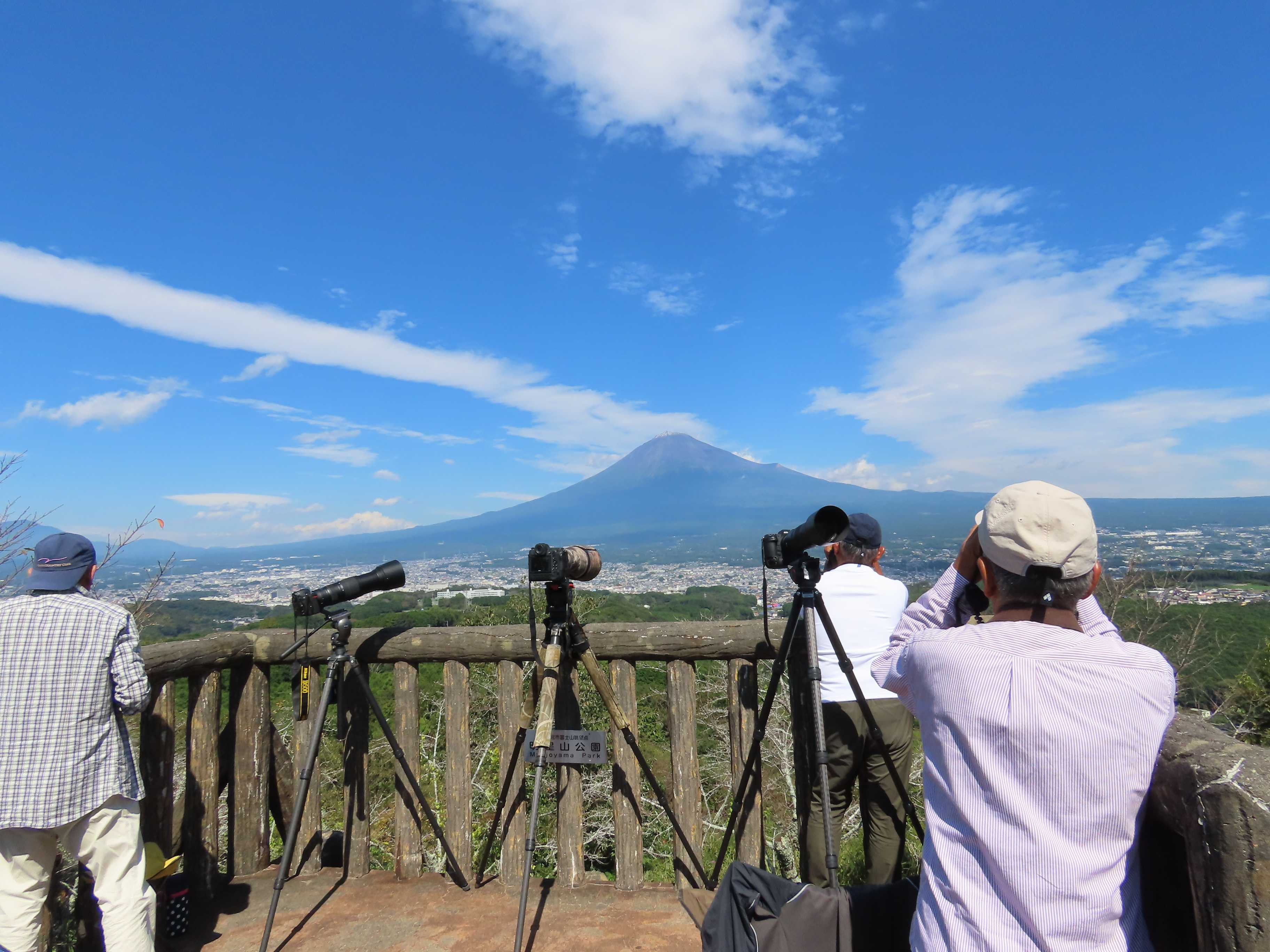 もっと近い所で見たくなり、低山ではあるが富士山の山すそから山頂までドーンと見渡せる富士宮市の明星山へ出かけた。富士川の左岸、新東名高速道路が眼下に走りロケーションは文句ない!うまくすればサシバの渡りも見られるかと双眼鏡も持参した。富士川を渡り、岩本山の山すそを走り、登山口に着いて支度をしていたら、なんと大丸山方面にサシバが30羽ほどゆったりと空を舞っているではないか。肉眼でもはっきり見て取れる。彼らは、タカ柱をつくってじきに西の空に飛び去っていった~一瞬の間で写真に収める間もなくみとれてしまった~